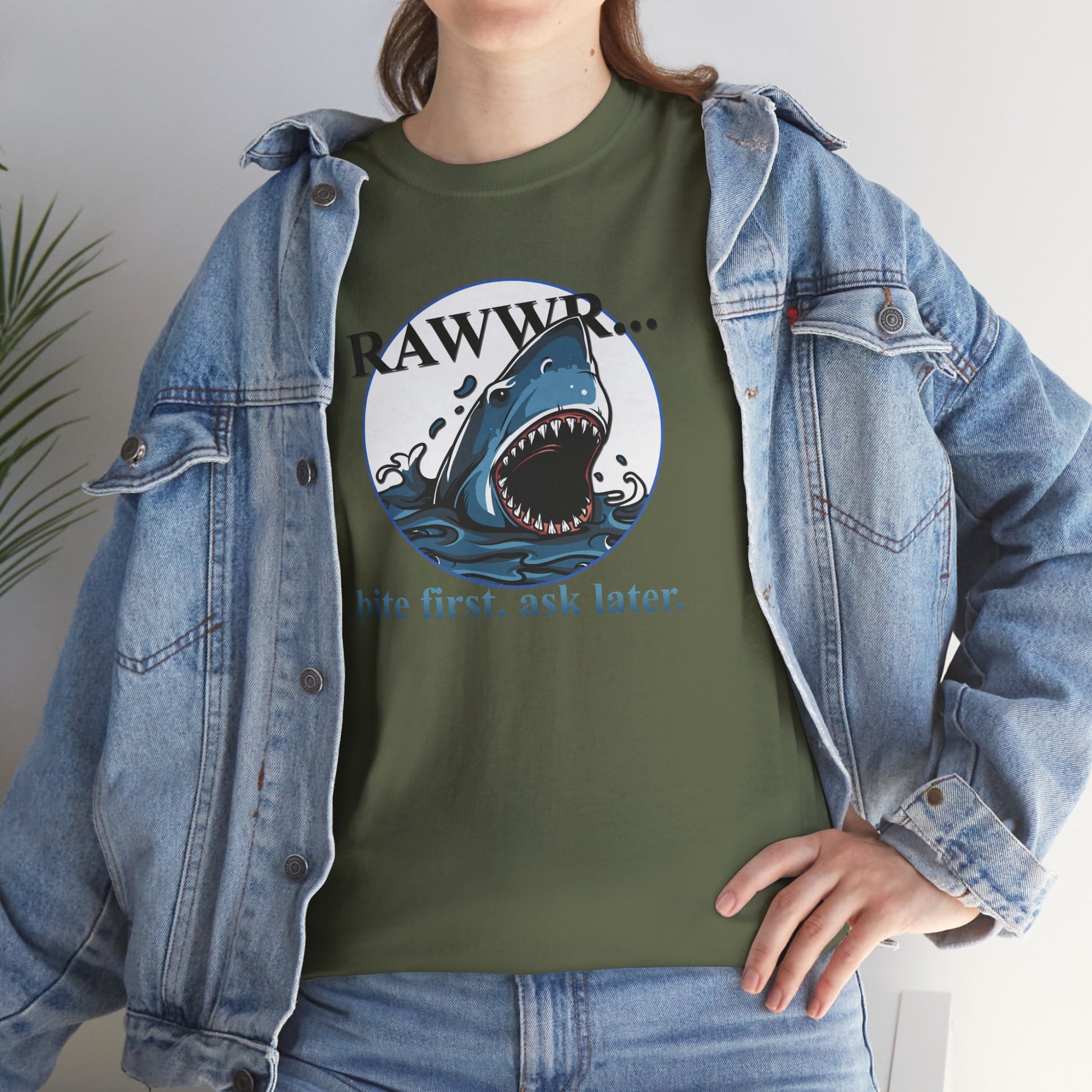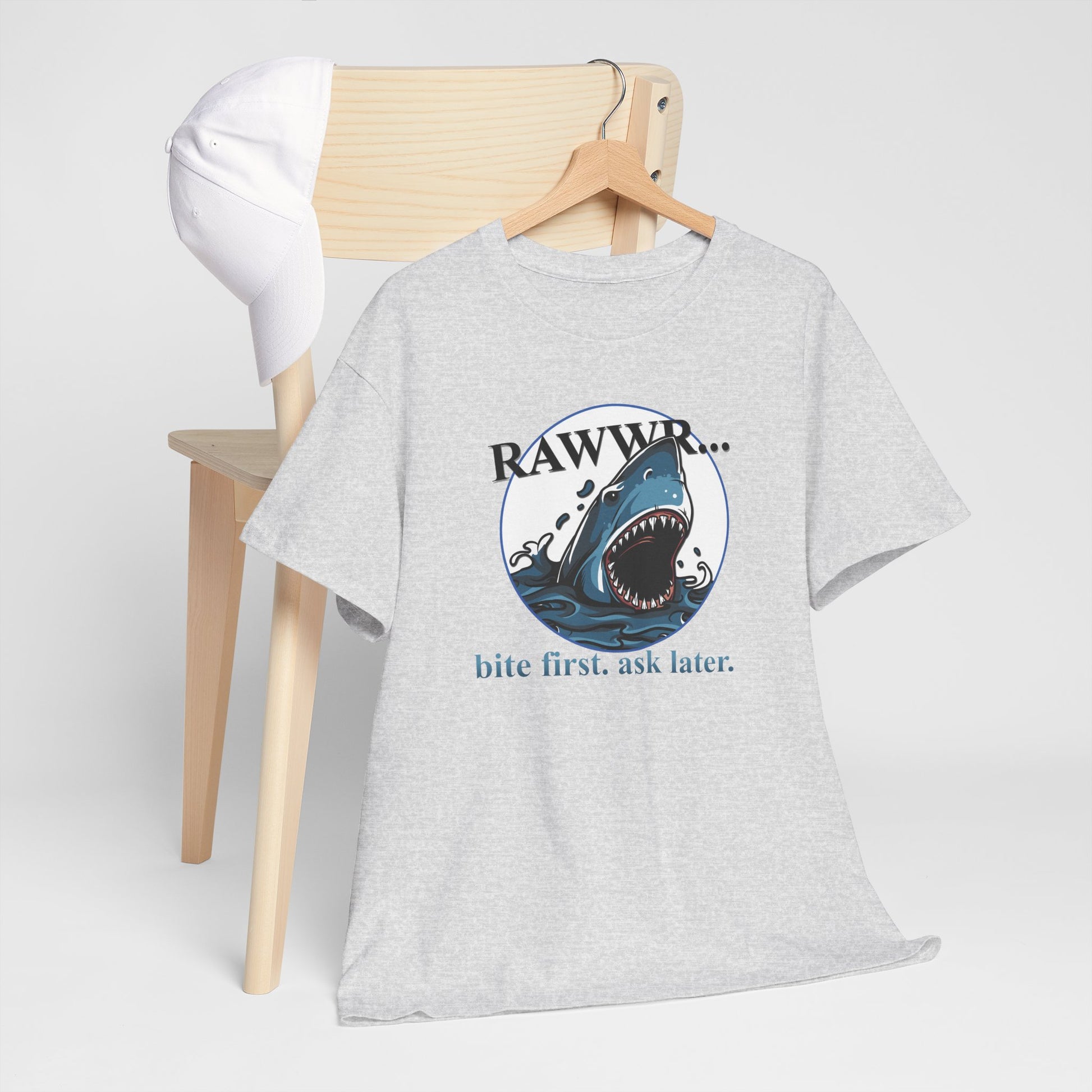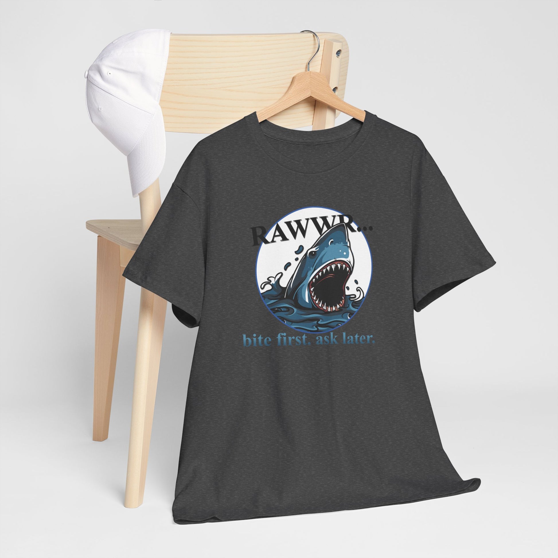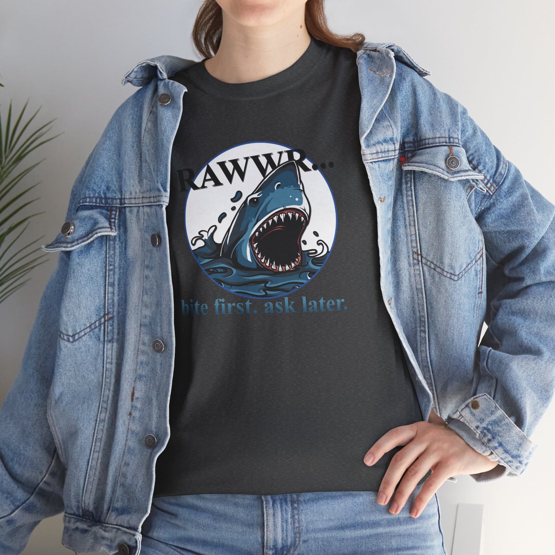 This unisex heavy cotton tee is designed to bring a playful vibe to your everyday wardrobe. Featuring a fun shark graphic with the words "RAWR... bite first, ask later," it adds a touch of humor and personality to your look. Perfect for casual outings, beach days, or any laid-back event, this shirt is an ideal choice for anyone who enjoys a whimsical twist in their fashion. It's great for gifting during summer festivities, birthdays, or just because. The shirt's classic fit and comfortable fabric ensure you'll wear it again and again, making it a staple in your collection.