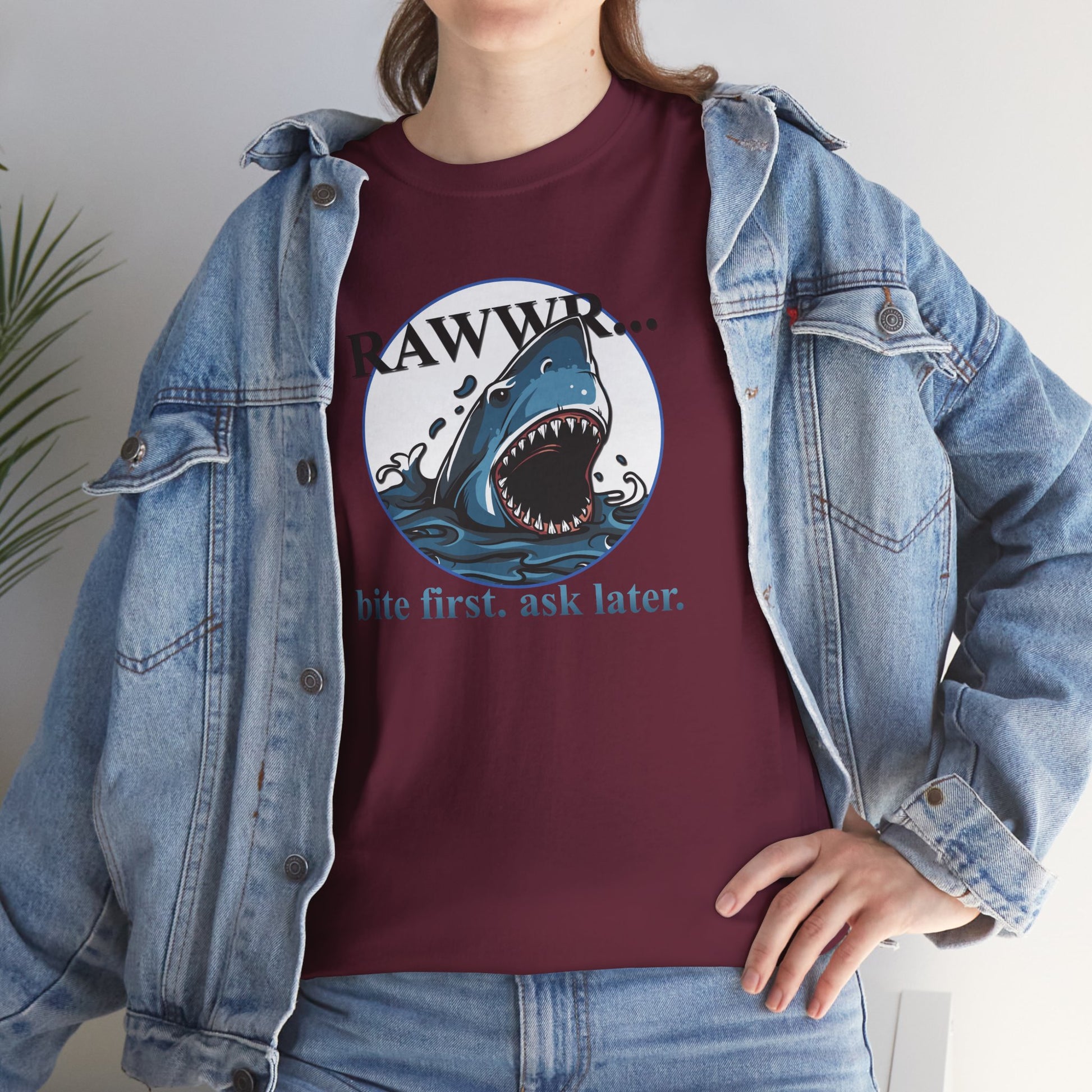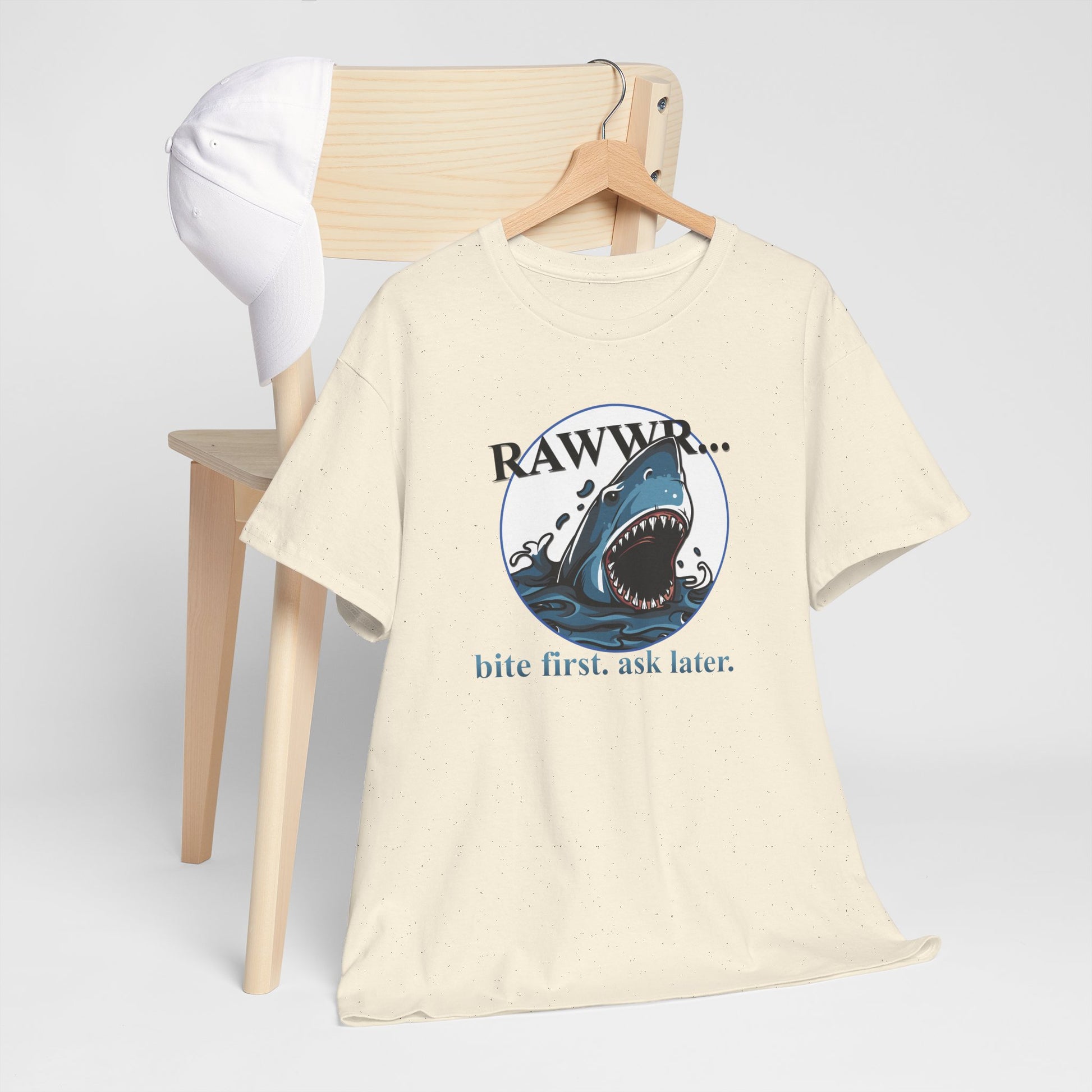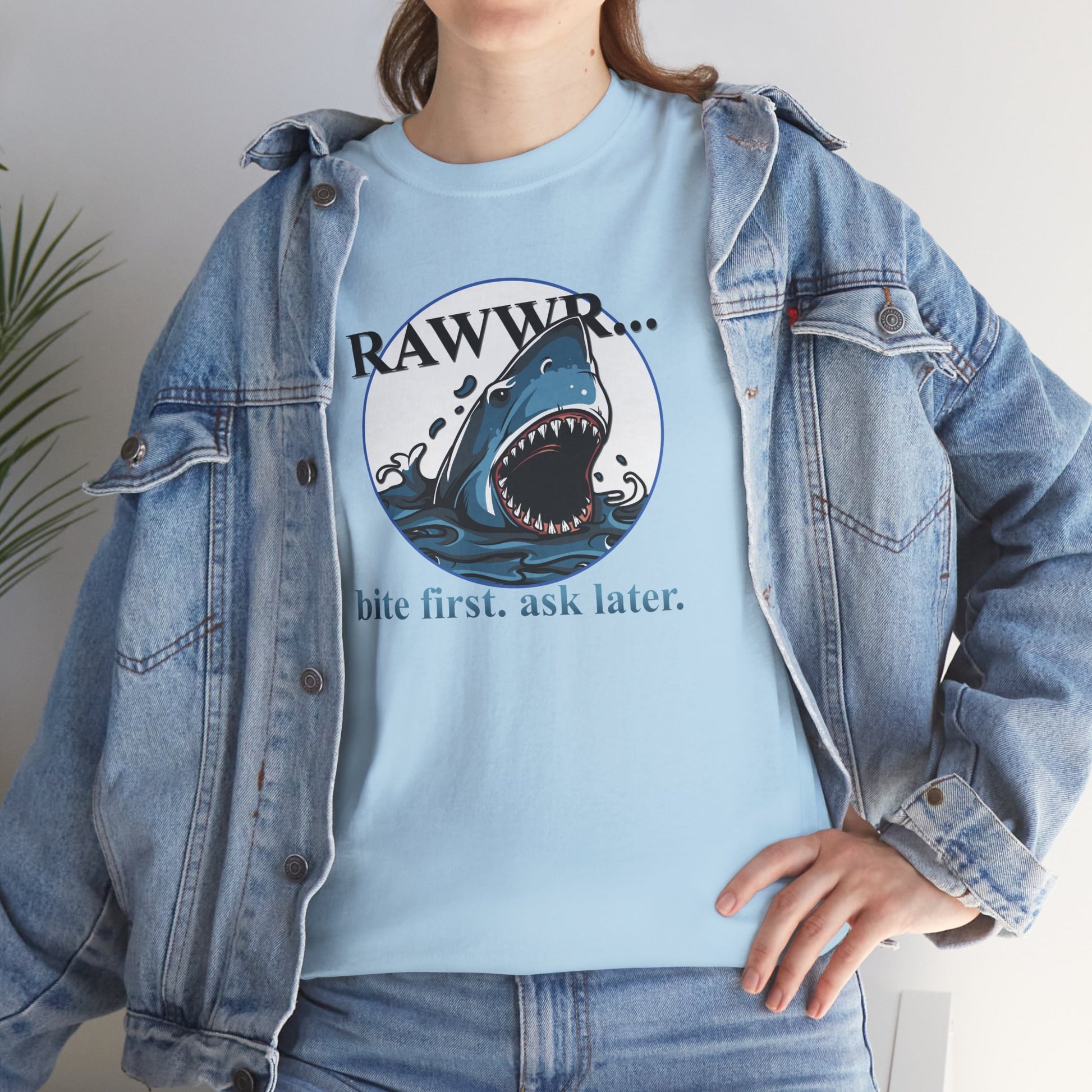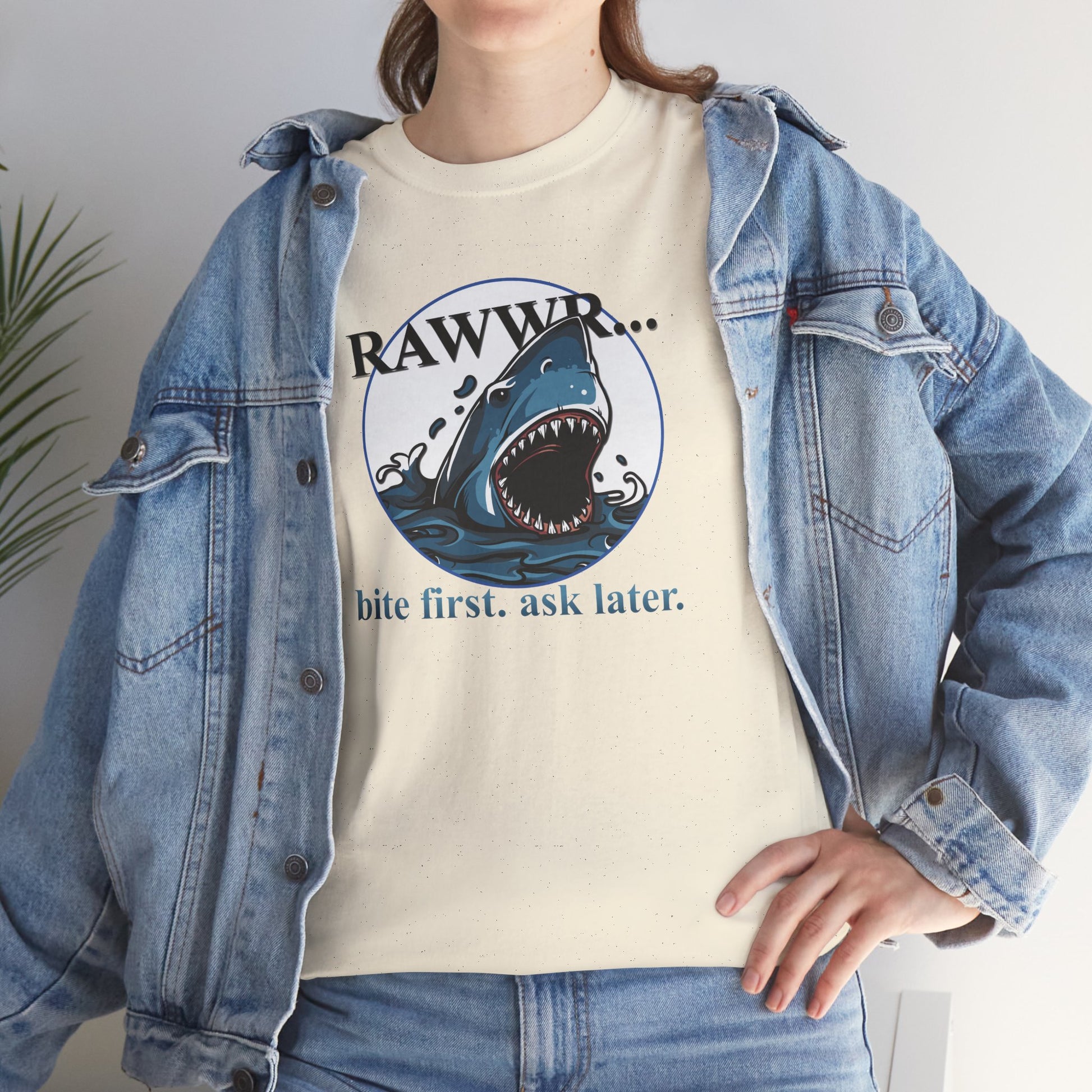 This unisex heavy cotton tee is designed to bring a playful vibe to your everyday wardrobe. Featuring a fun shark graphic with the words "RAWR... bite first, ask later," it adds a touch of humor and personality to your look. Perfect for casual outings, beach days, or any laid-back event, this shirt is an ideal choice for anyone who enjoys a whimsical twist in their fashion. It's great for gifting during summer festivities, birthdays, or just because. The shirt's classic fit and comfortable fabric ensure you'll wear it again and again, making it a staple in your collection.