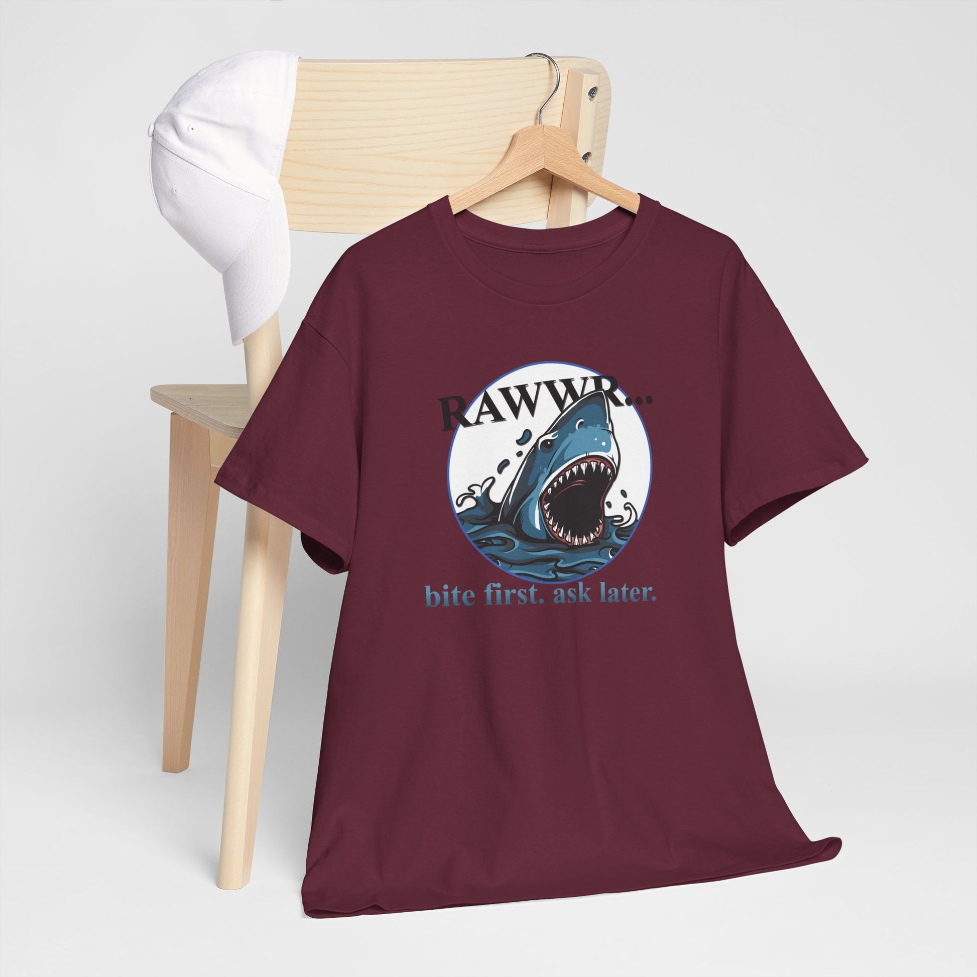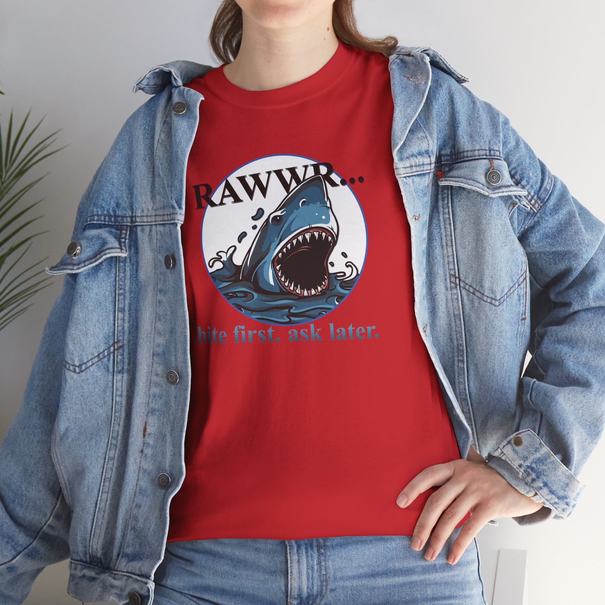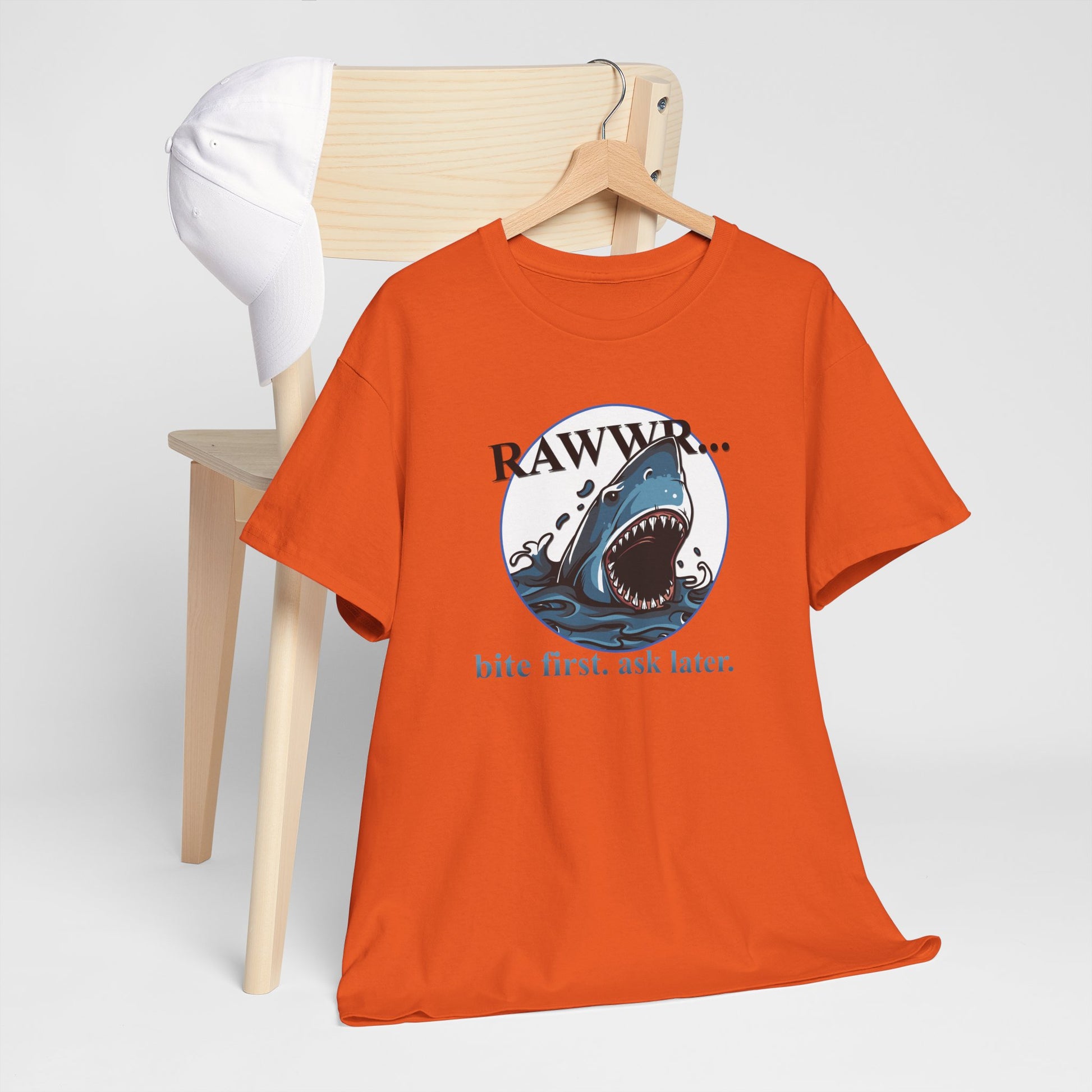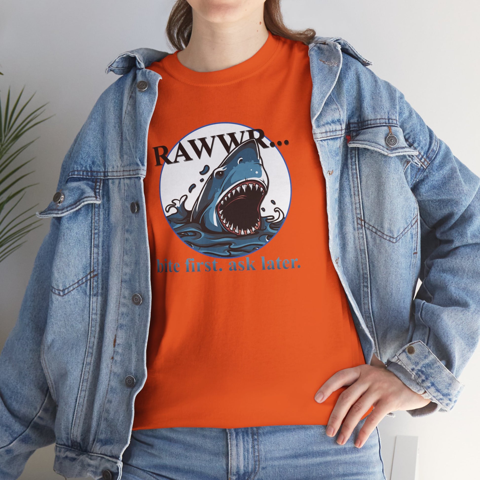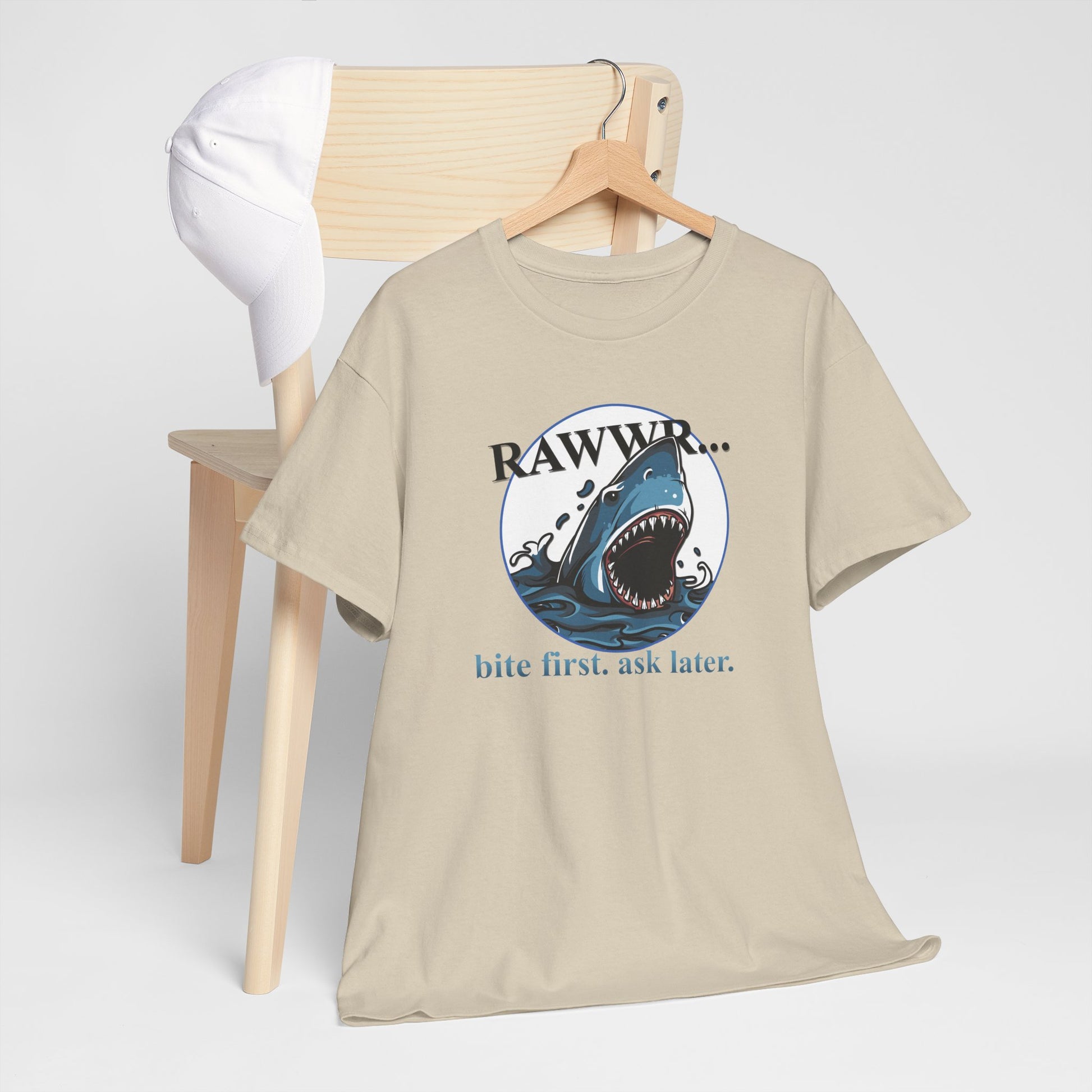 This unisex heavy cotton tee is designed to bring a playful vibe to your everyday wardrobe. Featuring a fun shark graphic with the words "RAWR... bite first, ask later," it adds a touch of humor and personality to your look. Perfect for casual outings, beach days, or any laid-back event, this shirt is an ideal choice for anyone who enjoys a whimsical twist in their fashion. It's great for gifting during summer festivities, birthdays, or just because. The shirt's classic fit and comfortable fabric ensure you'll wear it again and again, making it a staple in your collection.