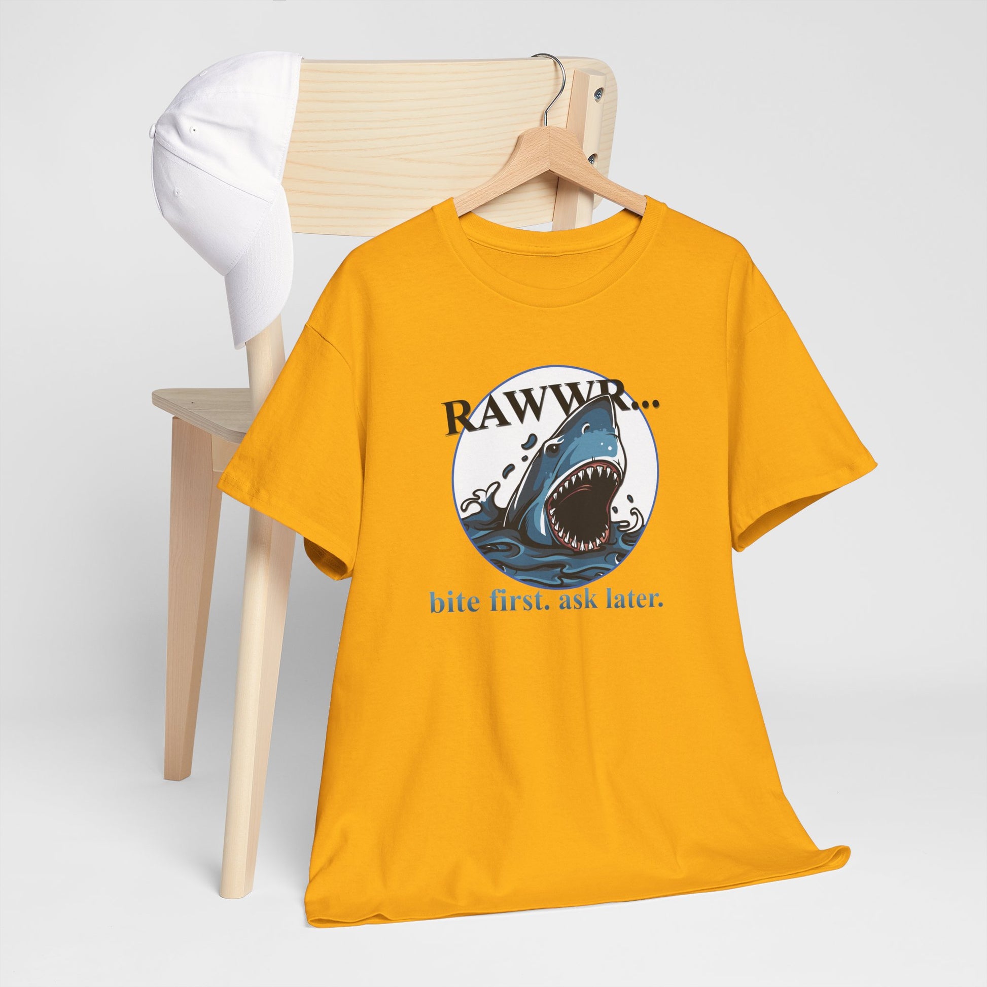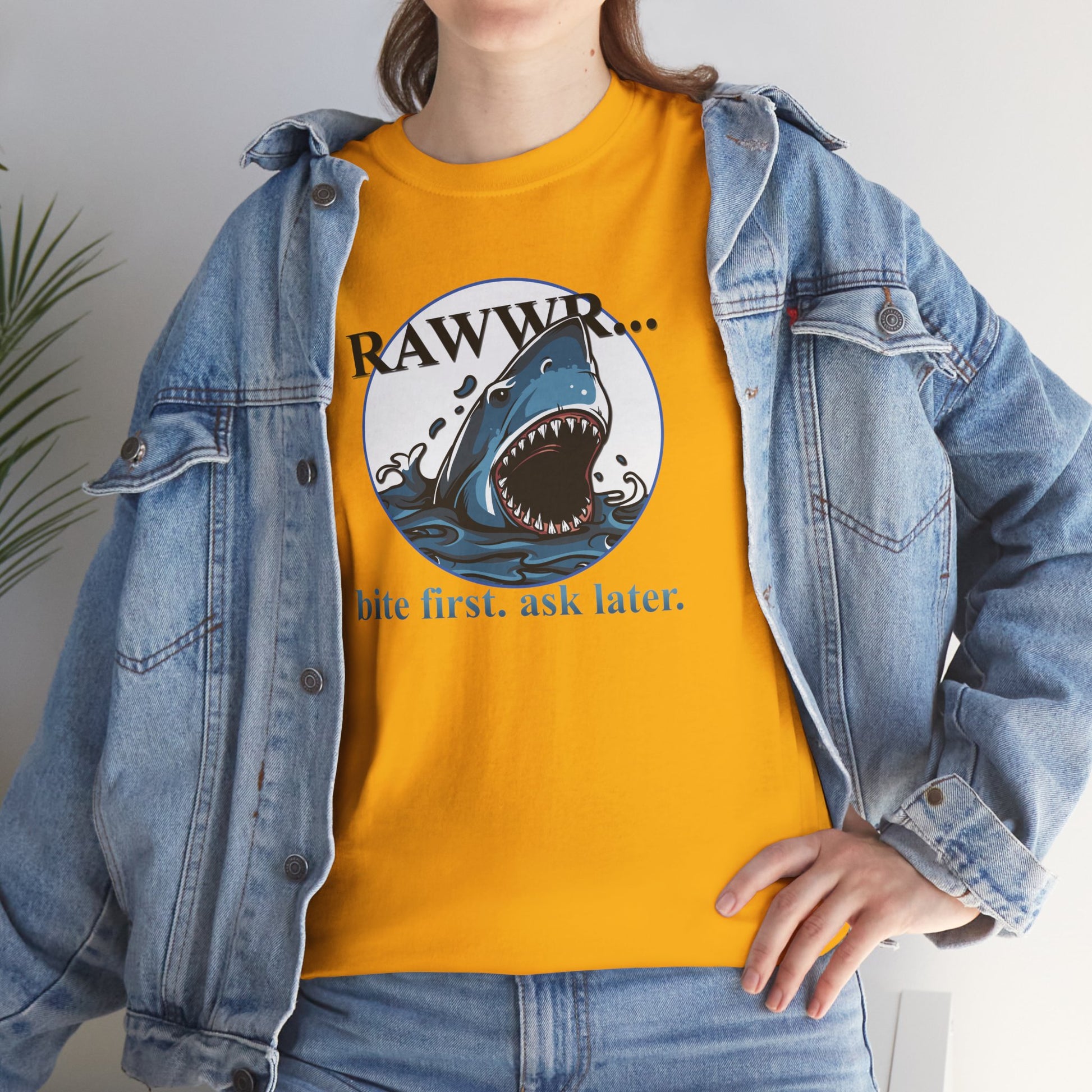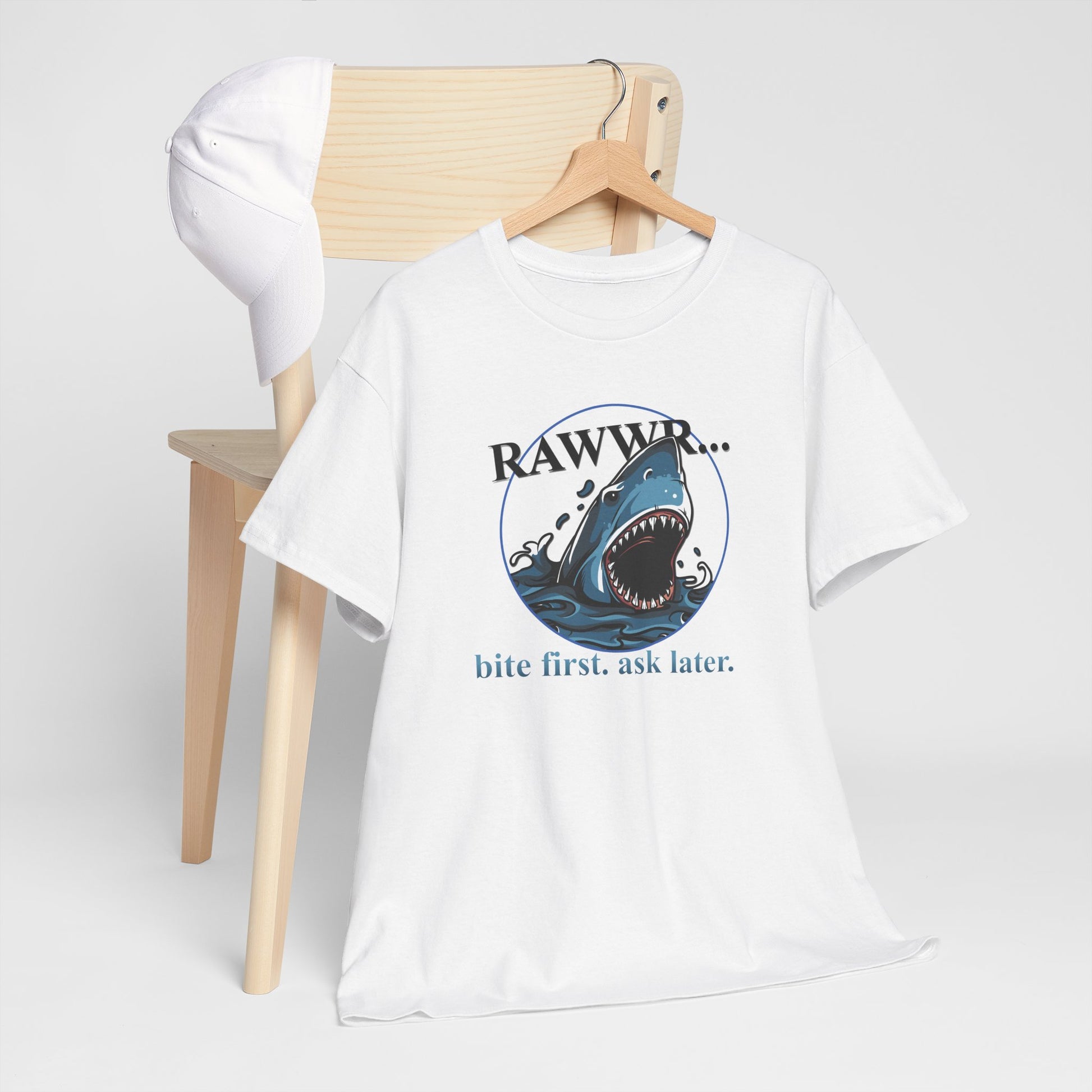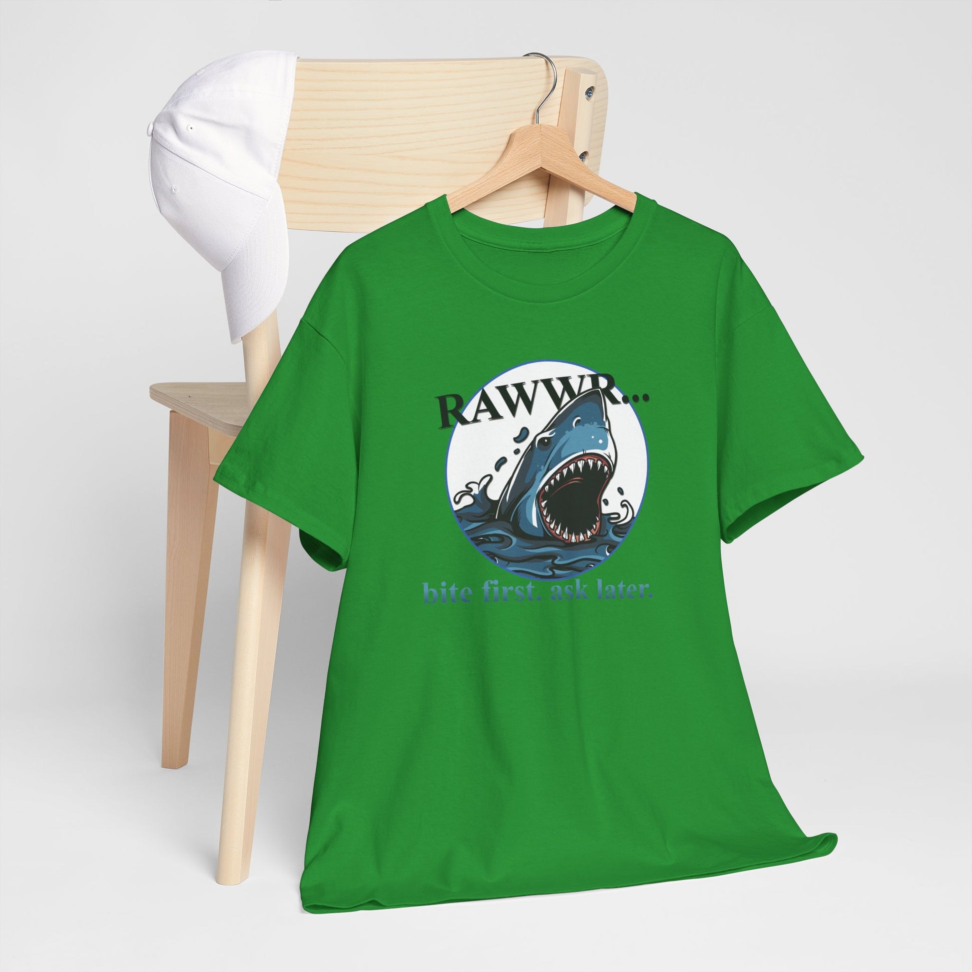 This unisex heavy cotton tee is designed to bring a playful vibe to your everyday wardrobe. Featuring a fun shark graphic with the words "RAWR... bite first, ask later," it adds a touch of humor and personality to your look. Perfect for casual outings, beach days, or any laid-back event, this shirt is an ideal choice for anyone who enjoys a whimsical twist in their fashion. It's great for gifting during summer festivities, birthdays, or just because. The shirt's classic fit and comfortable fabric ensure you'll wear it again and again, making it a staple in your collection.