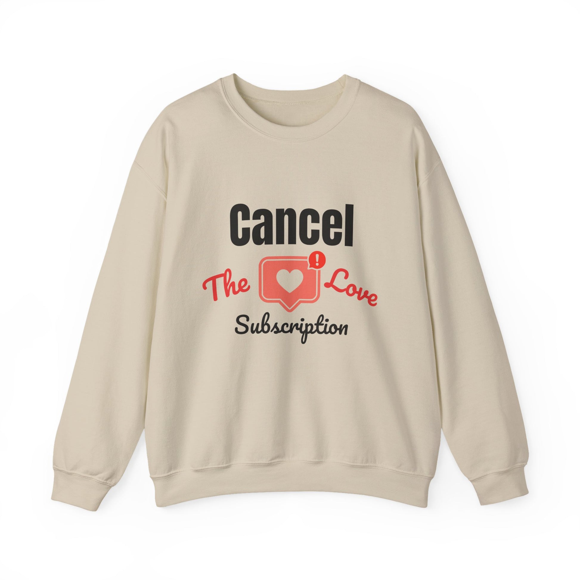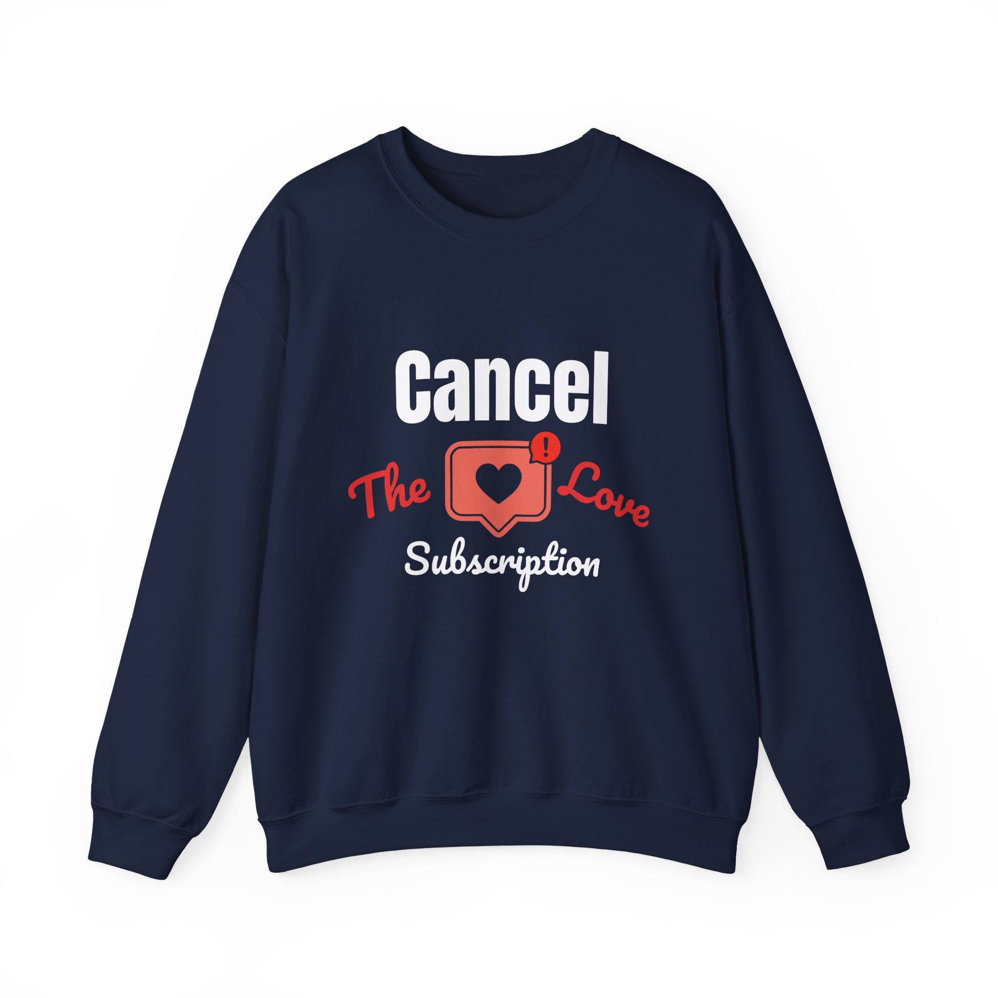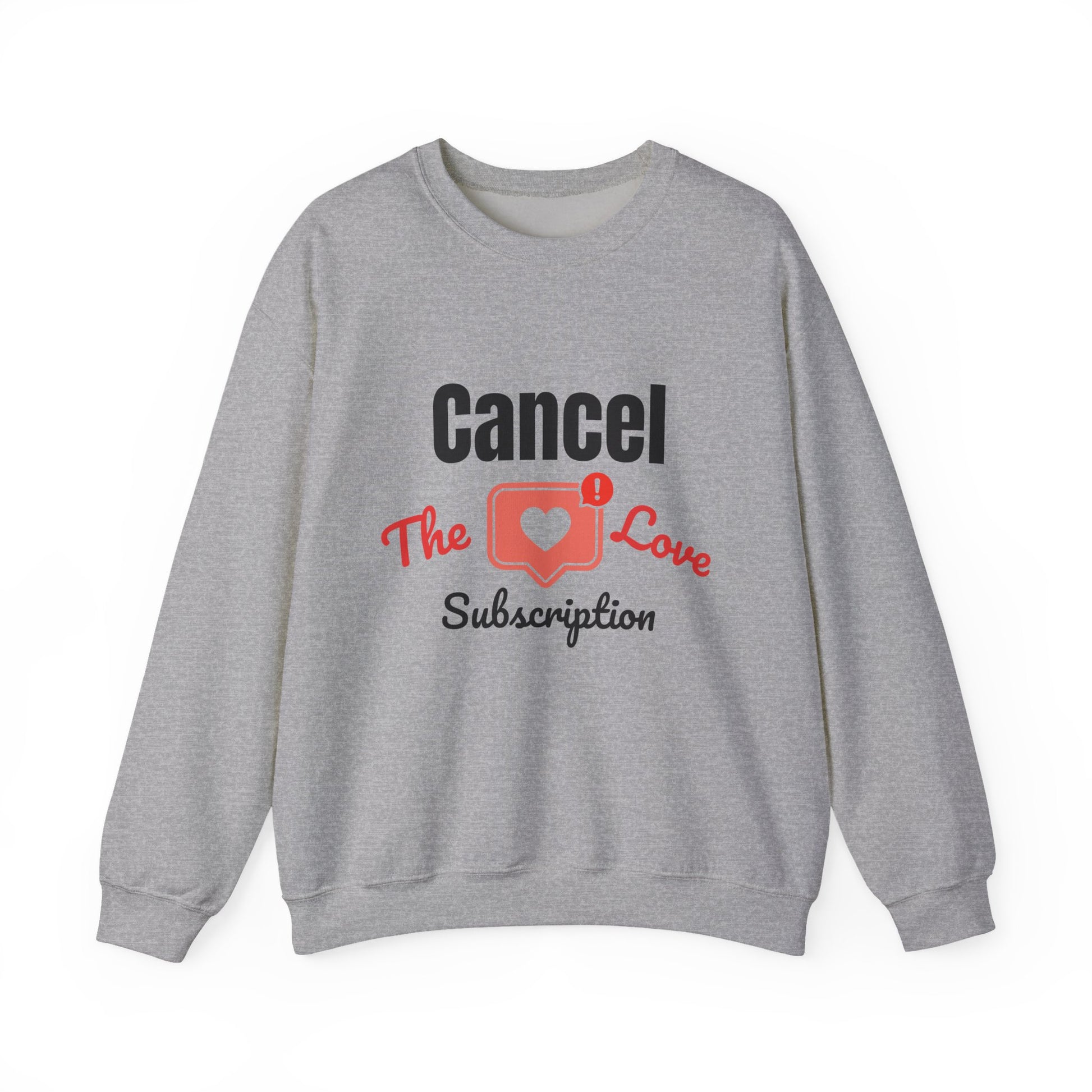Lightweight warmth with a wink — this crewneck brings quiet comfort and a cheeky message into your everyday rotation. Soft, balanced cotton-poly fabric holds its shape while the ribbed neckline and reinforced seams stand up to repeated wear. The front features a playful, slightly ironic design that reads like a small personal protest: bold type paired with a heart-and-notification graphic that reads “Cancel the Love Subscription.” It settles in like a trusted layer on cool mornings, during slow coffee runs, movie nights, or weekend walks when you want to say less and mean more. Subtle enough to pair with jeans or joggers, the sweatshirt wears like a familiar companion — cozy, honest, and a little sardonic.