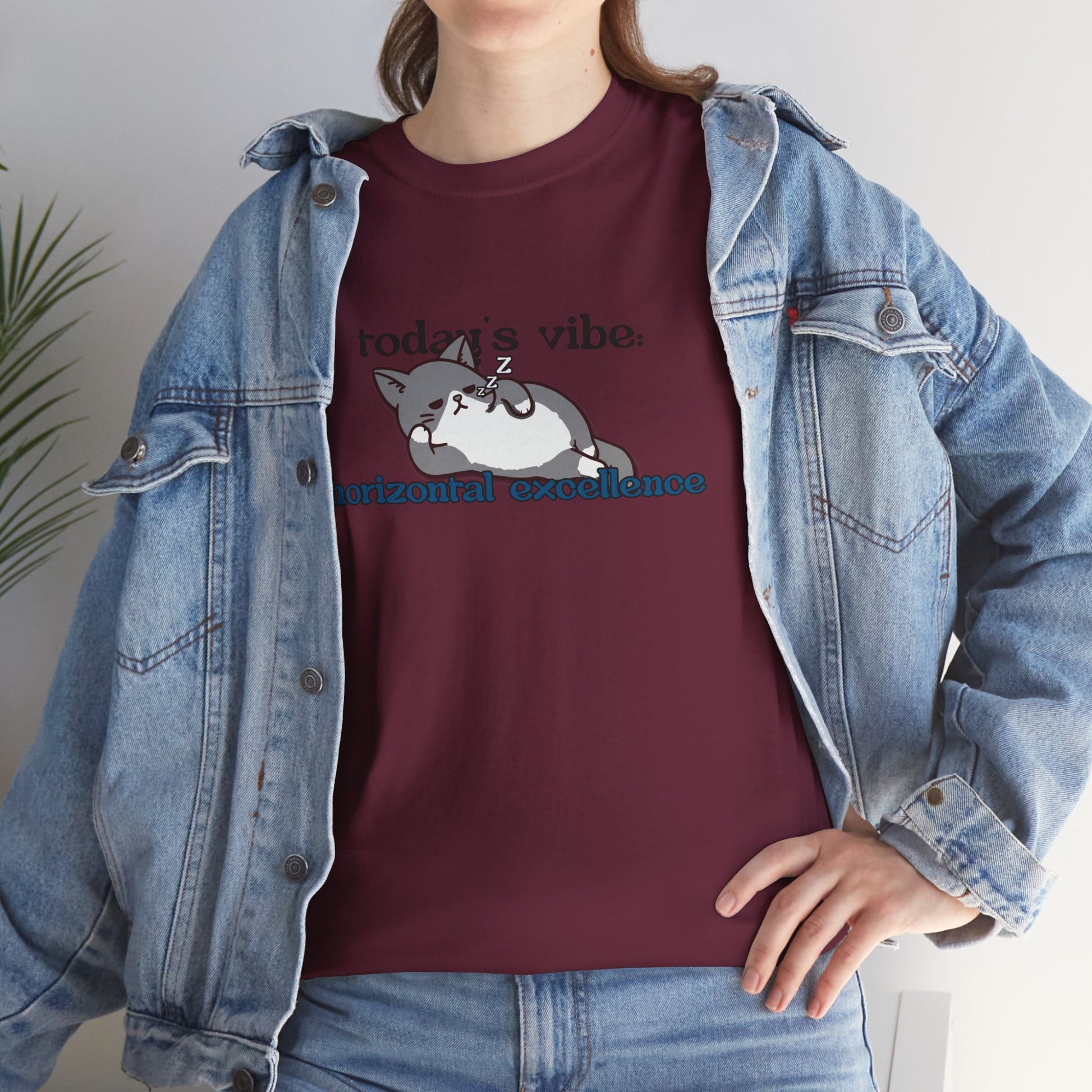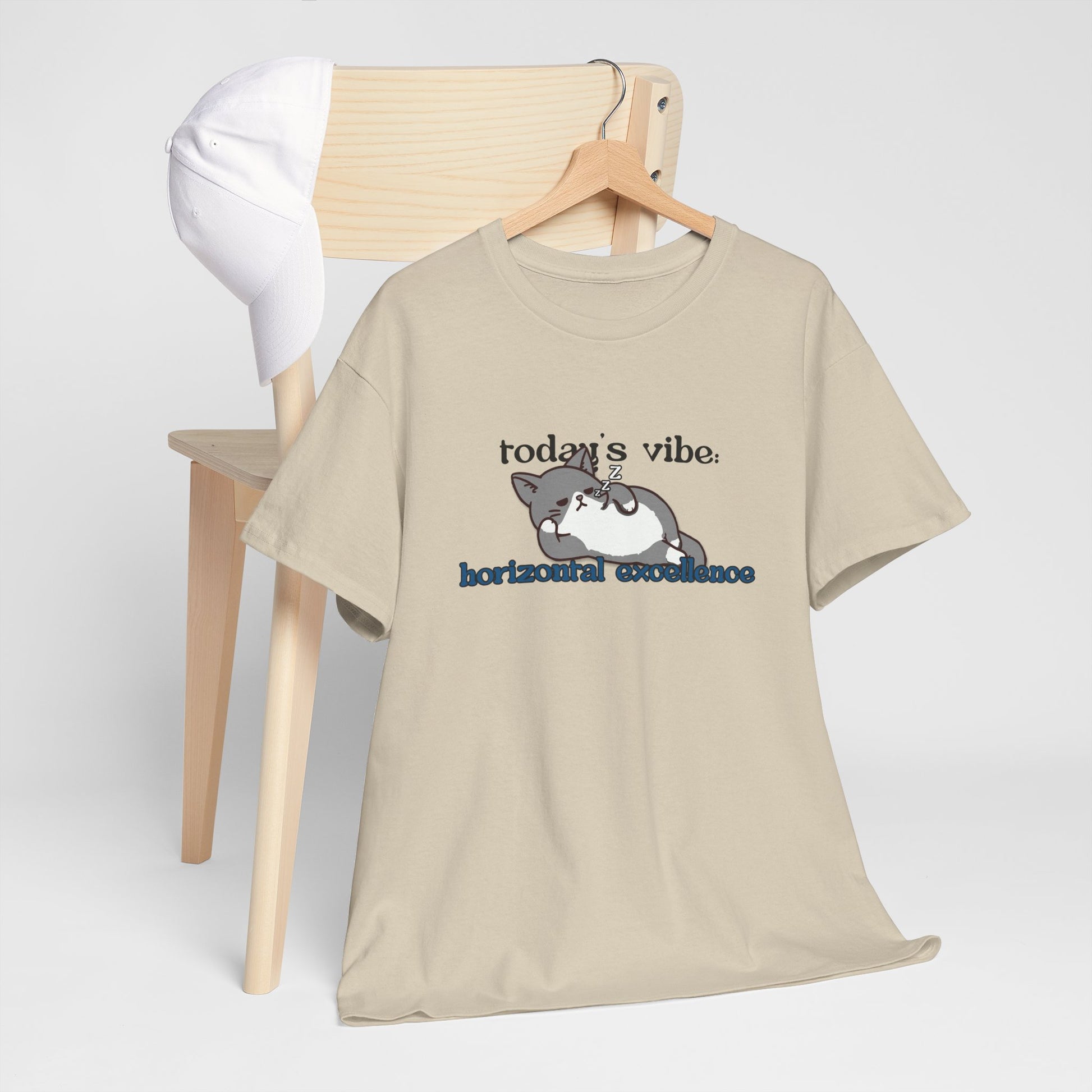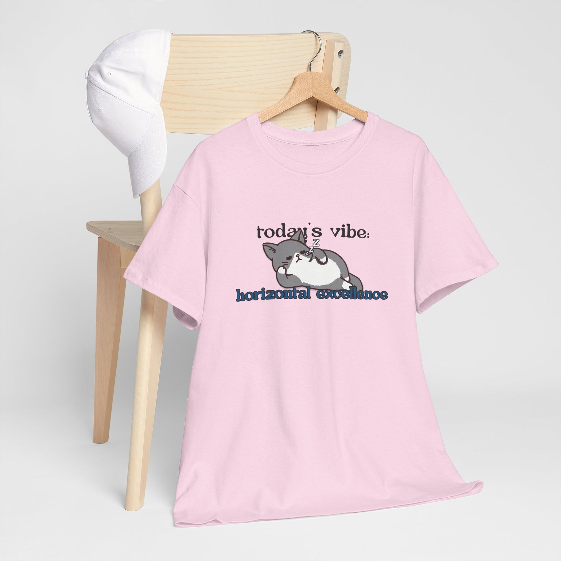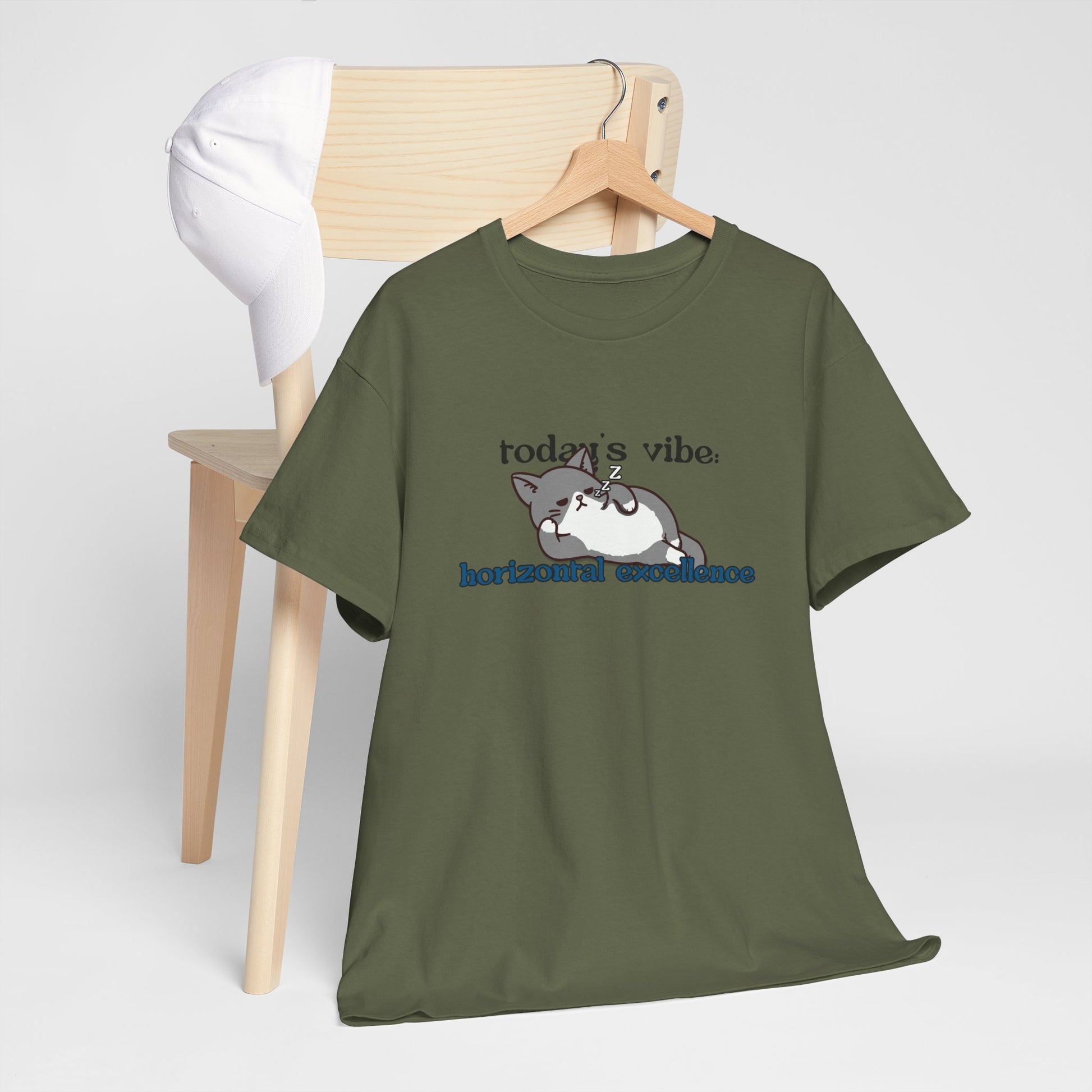 Introducing this versatile Unisex Heavy Cotton Tee, perfect for adding a playful touch to your everyday outfits. With its lighthearted message, "today's vibe: horizontal excellence," this tee speaks to those who appreciate humor and comfort in their wardrobe. The soft, breathable fabric makes it suitable for lounging at home, casual outings, or even a fun gathering with friends. Ideal for adults who wish to express their laid-back lifestyle, this tee is an excellent gift for birthdays, casual holidays, or just as a treat for someone special. Celebrate comfort and style with this chic addition to any wardrobe.