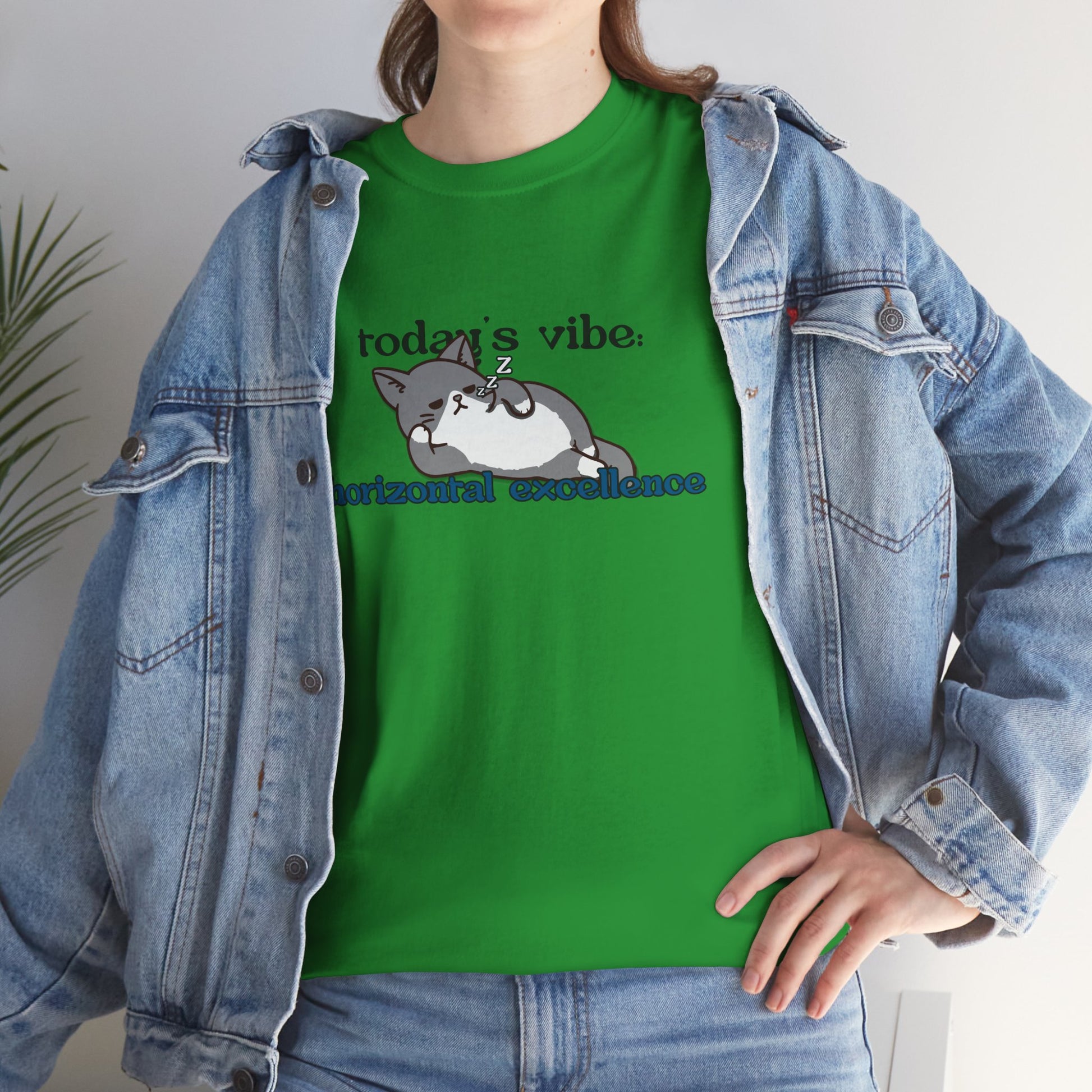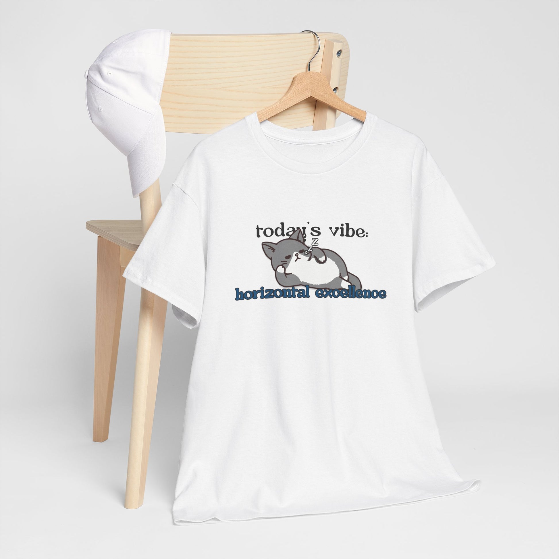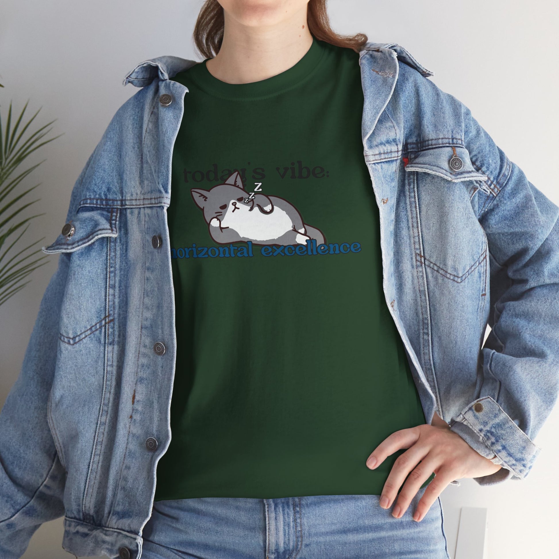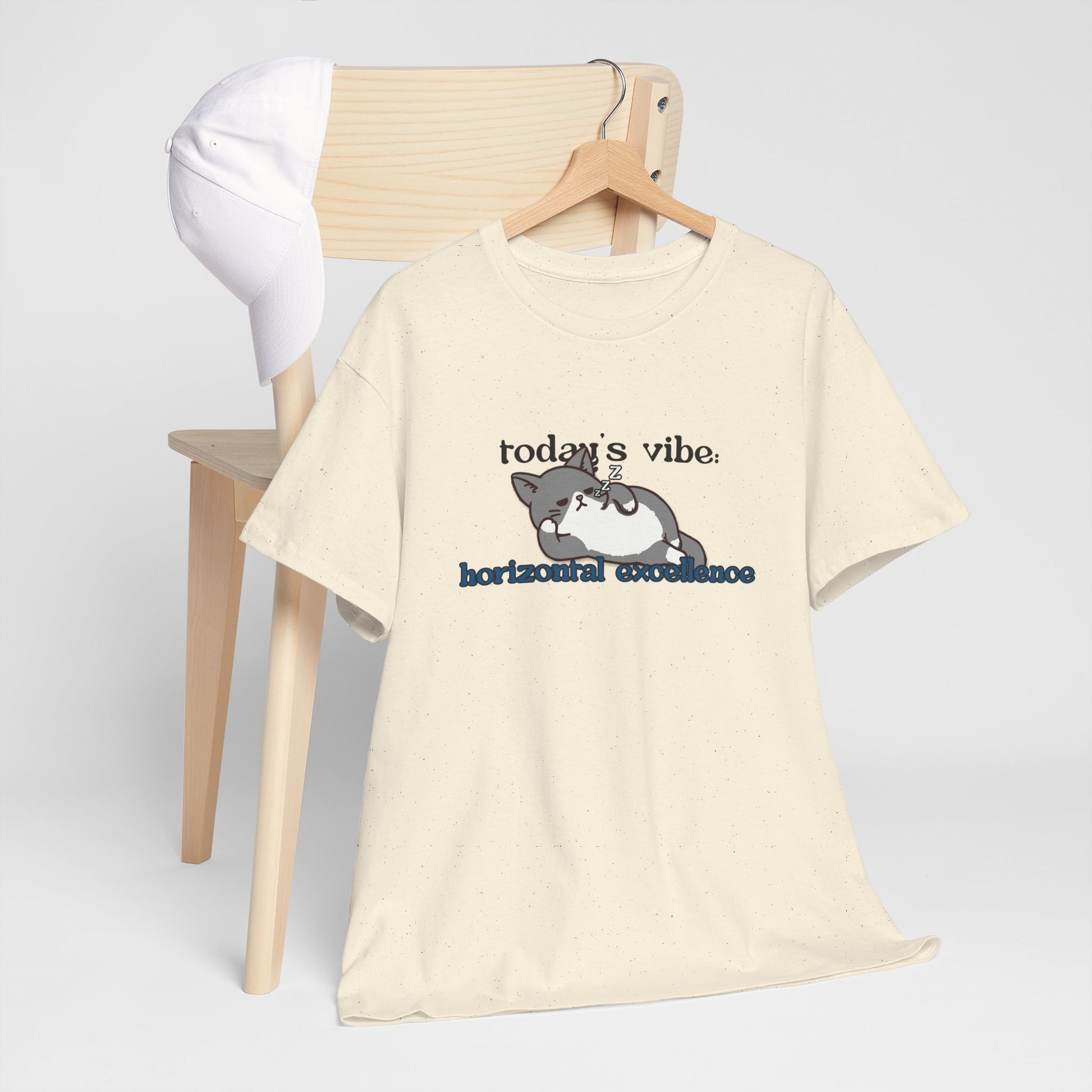 Introducing this versatile Unisex Heavy Cotton Tee, perfect for adding a playful touch to your everyday outfits. With its lighthearted message, "today's vibe: horizontal excellence," this tee speaks to those who appreciate humor and comfort in their wardrobe. The soft, breathable fabric makes it suitable for lounging at home, casual outings, or even a fun gathering with friends. Ideal for adults who wish to express their laid-back lifestyle, this tee is an excellent gift for birthdays, casual holidays, or just as a treat for someone special. Celebrate comfort and style with this chic addition to any wardrobe.
