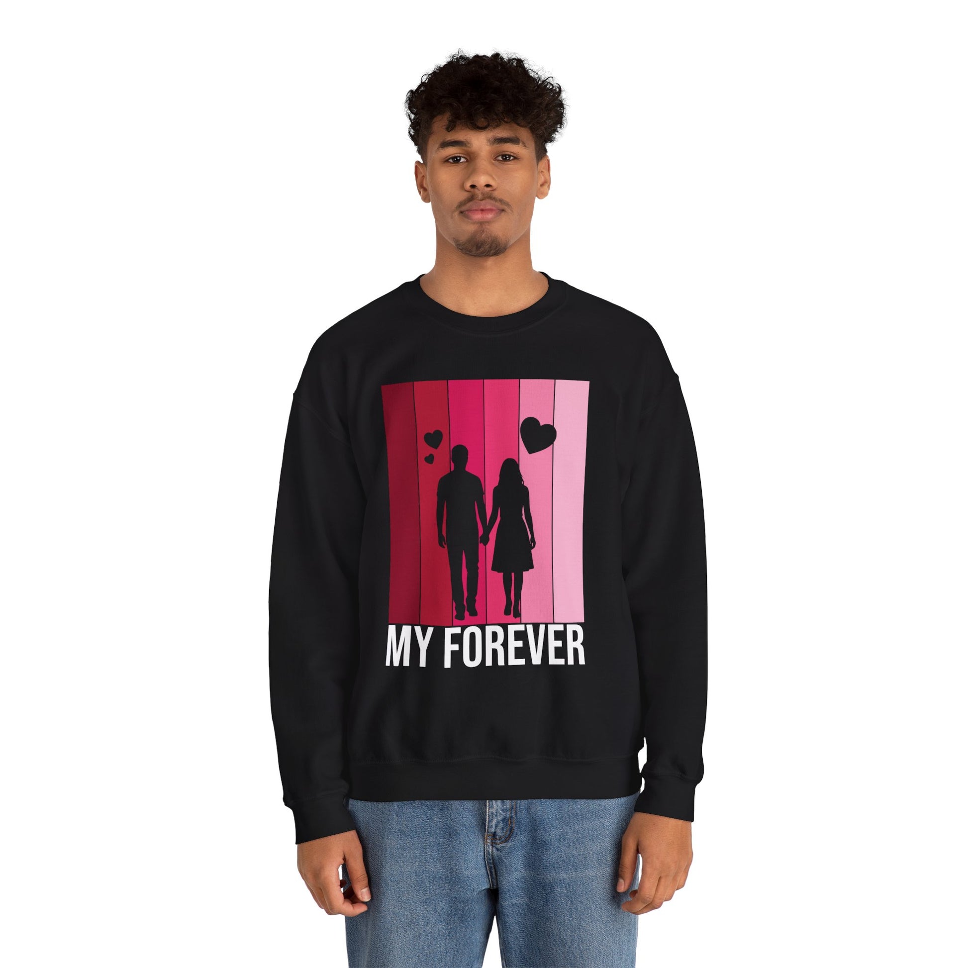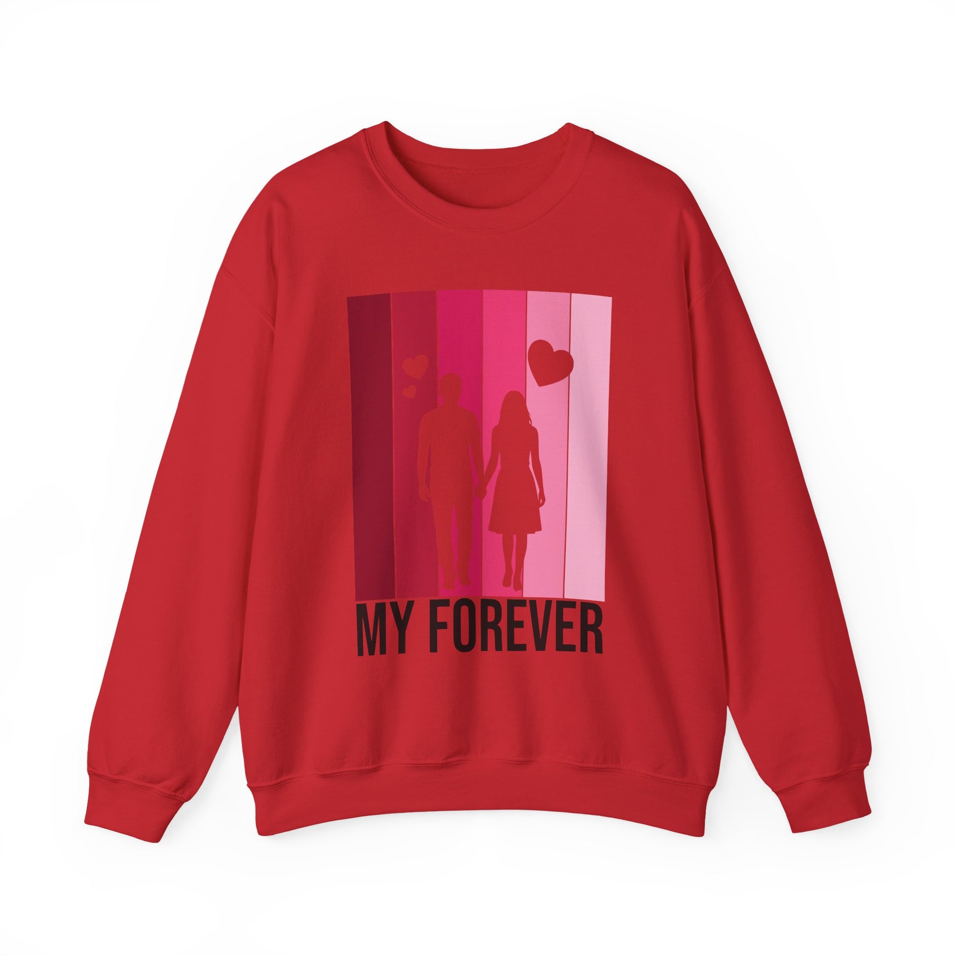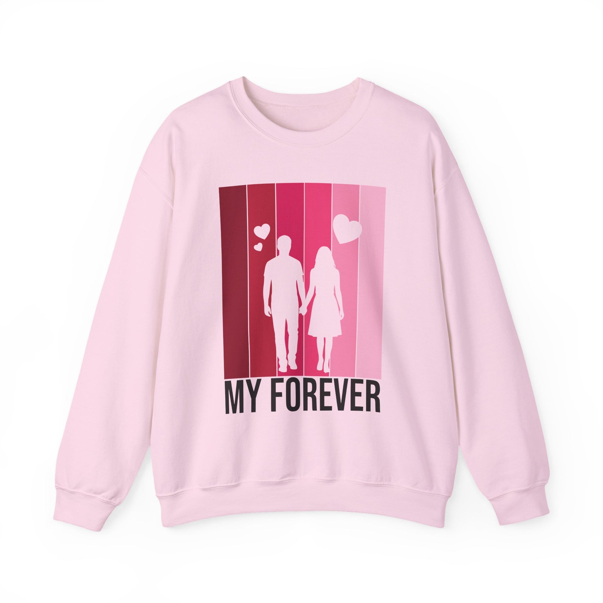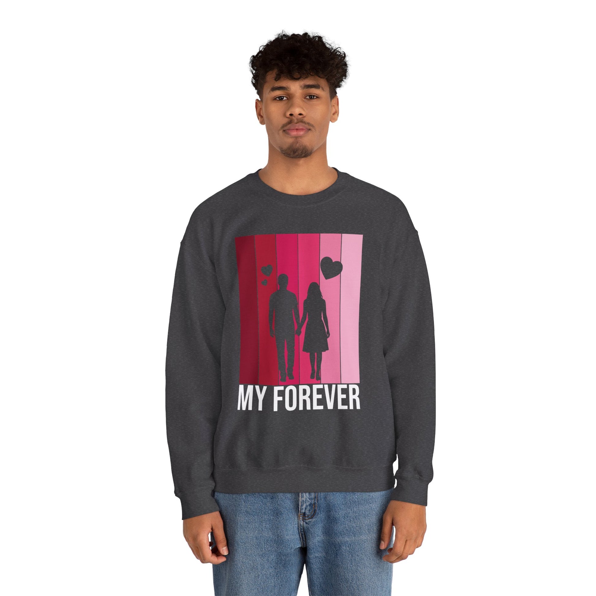 Soft, warm, and quietly romantic — this cozy crewneck brings a gentle reminder of togetherness into everyday wear. The medium‑weight cotton‑poly blend feels lived‑in from the first wear, while the clean crew neckline and classic fit make it easy to layer over shirts or lounge in on slow mornings. A simplified silhouette of two figures walking hand in hand sits against a vertical gradient of rosy pinks, with small hearts rising above and the words “MY FOREVER” grounding the design. It’s built to last: reinforced stitching at stress points and a tear‑away label keep comfort high and fuss low. Wear it on casual date nights, slow weekend strolls, or quiet evenings at home to carry a warm, personal sentiment wherever you go.