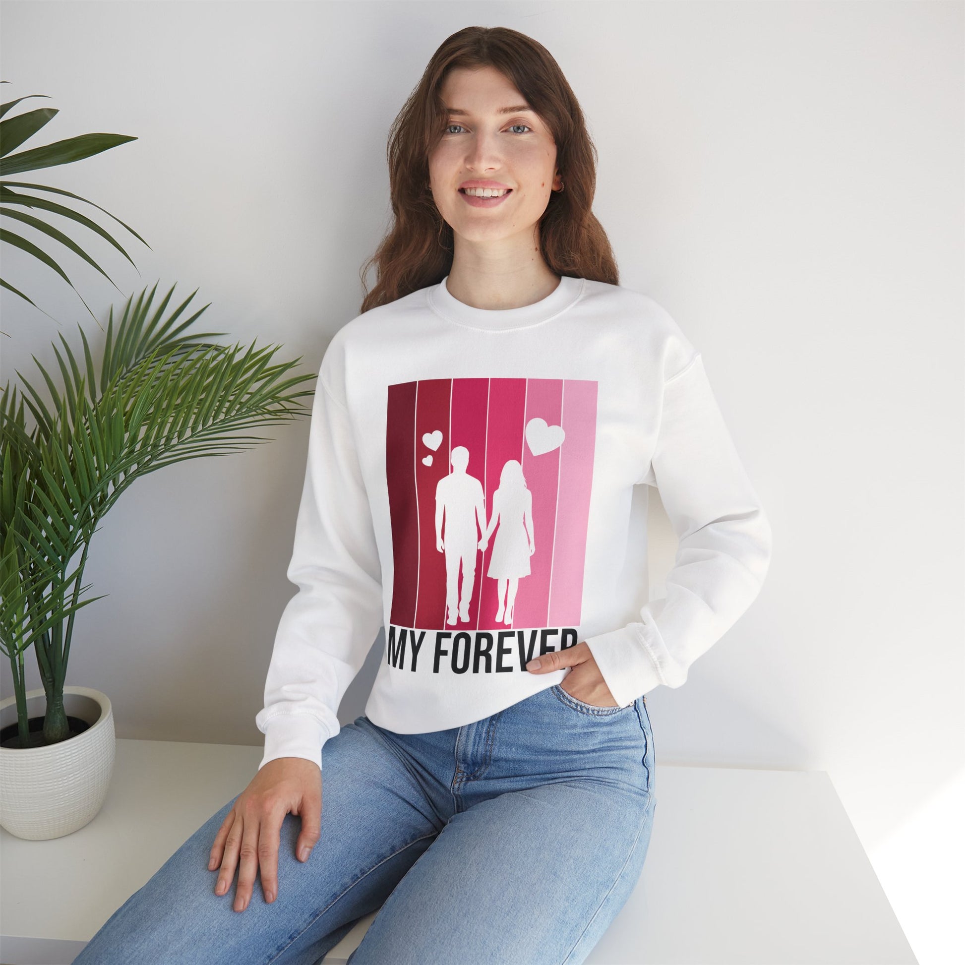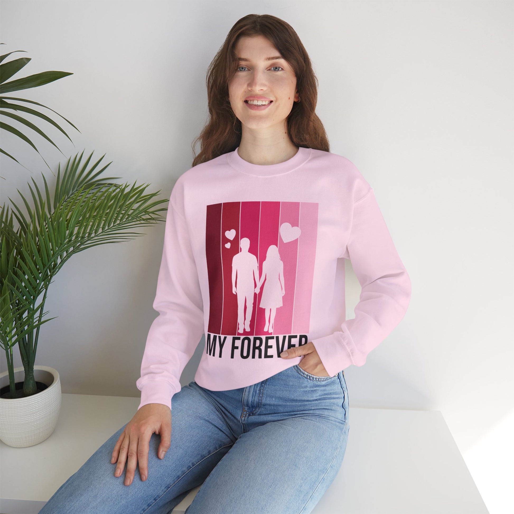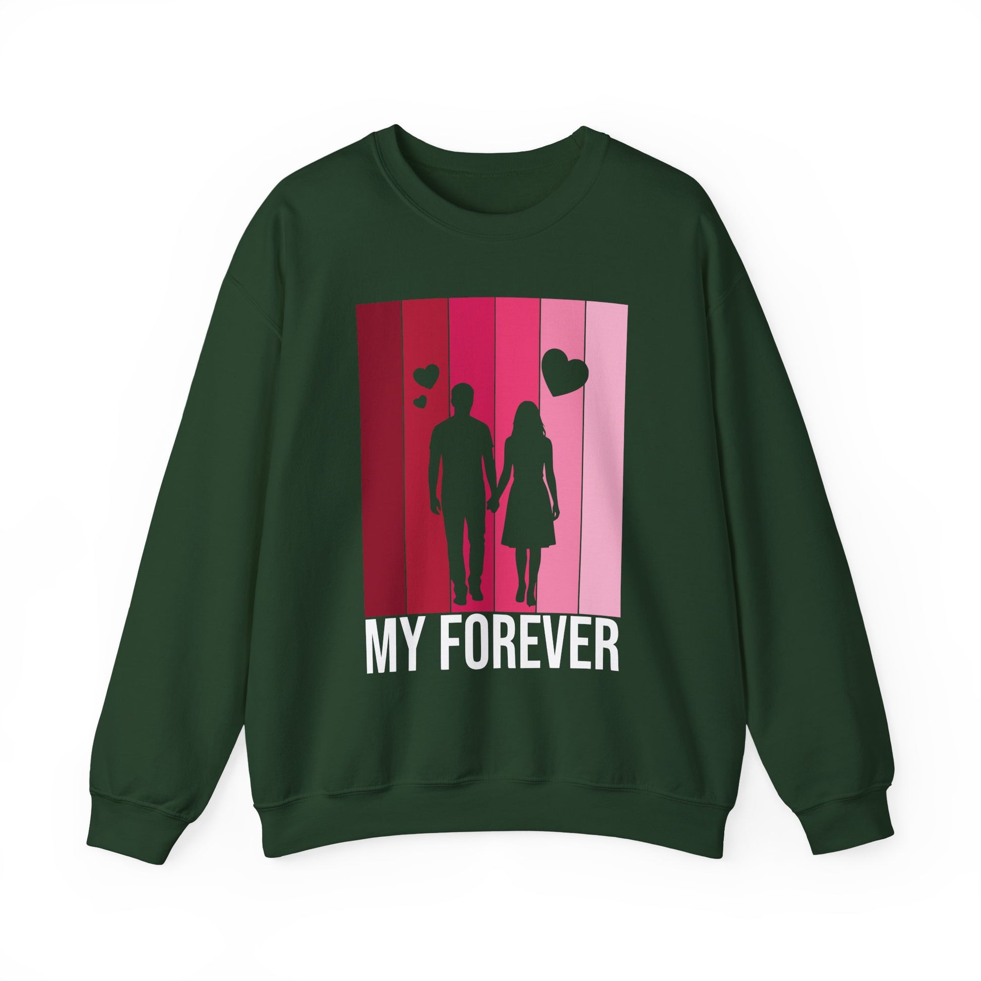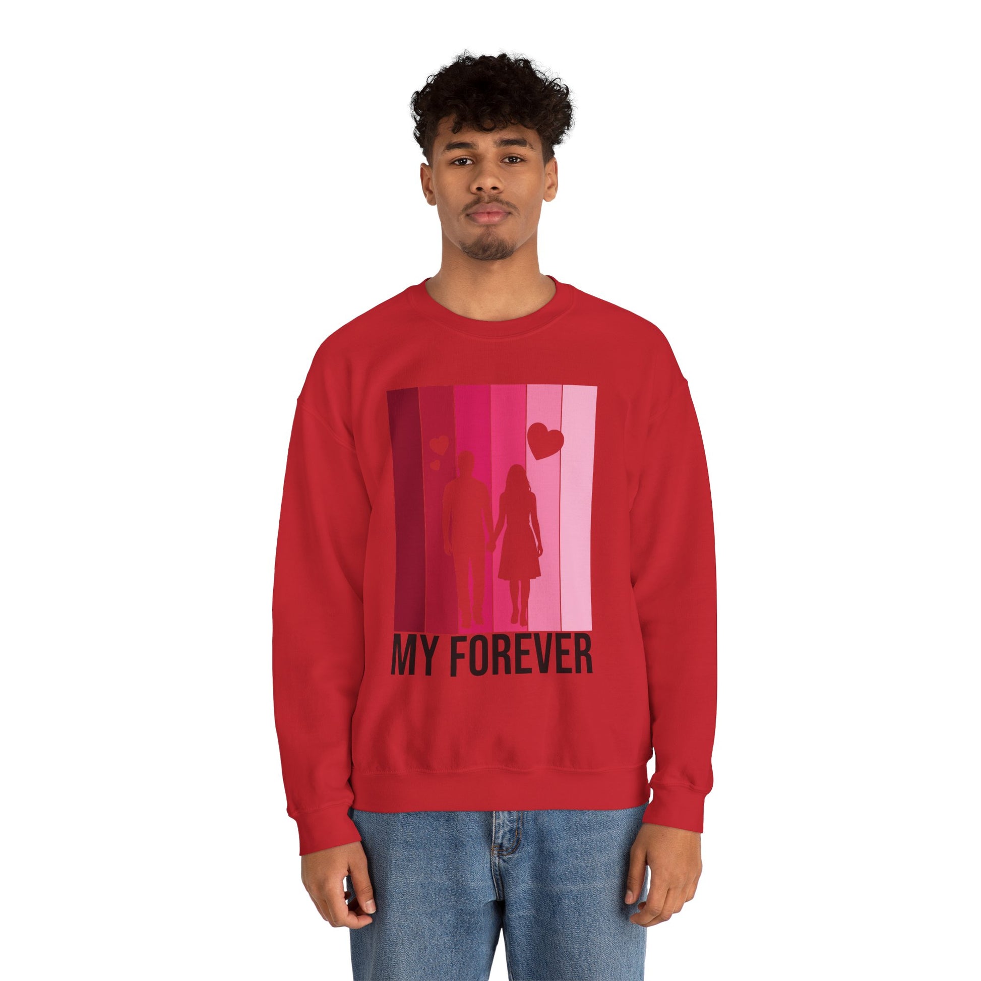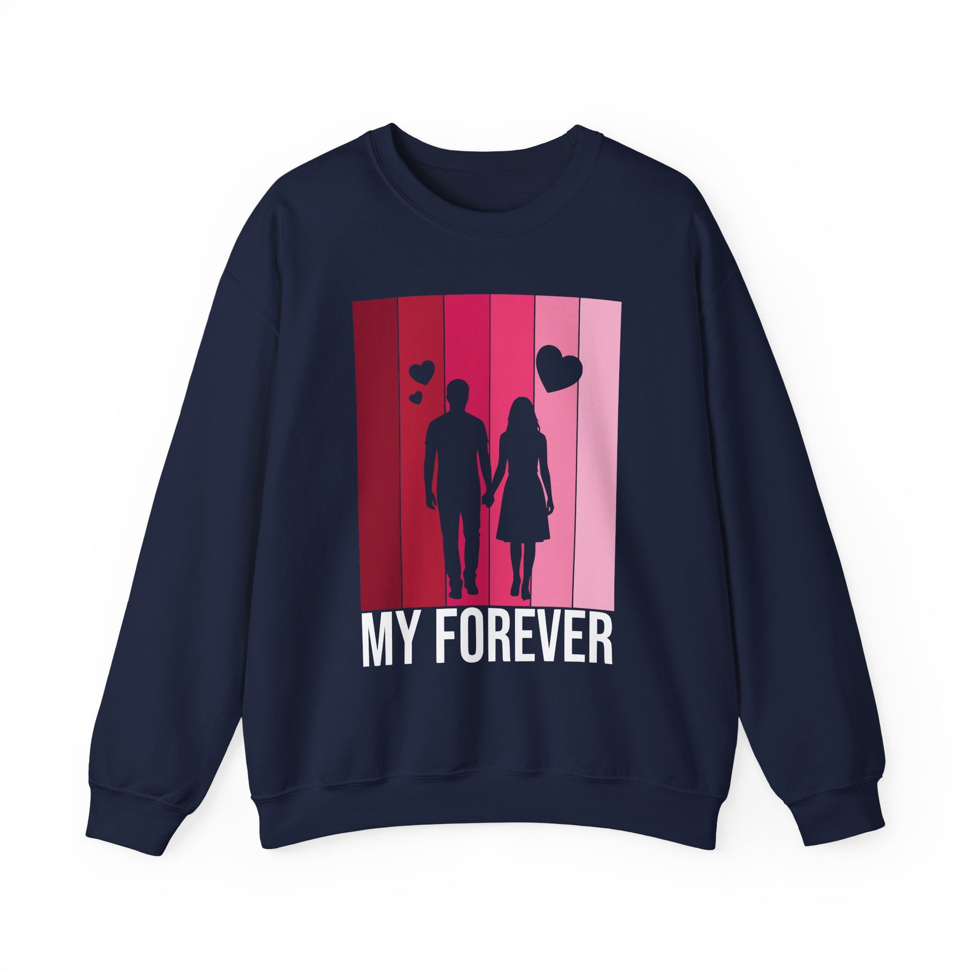 Soft, warm, and quietly romantic — this cozy crewneck brings a gentle reminder of togetherness into everyday wear. The medium‑weight cotton‑poly blend feels lived‑in from the first wear, while the clean crew neckline and classic fit make it easy to layer over shirts or lounge in on slow mornings. A simplified silhouette of two figures walking hand in hand sits against a vertical gradient of rosy pinks, with small hearts rising above and the words “MY FOREVER” grounding the design. It’s built to last: reinforced stitching at stress points and a tear‑away label keep comfort high and fuss low. Wear it on casual date nights, slow weekend strolls, or quiet evenings at home to carry a warm, personal sentiment wherever you go.