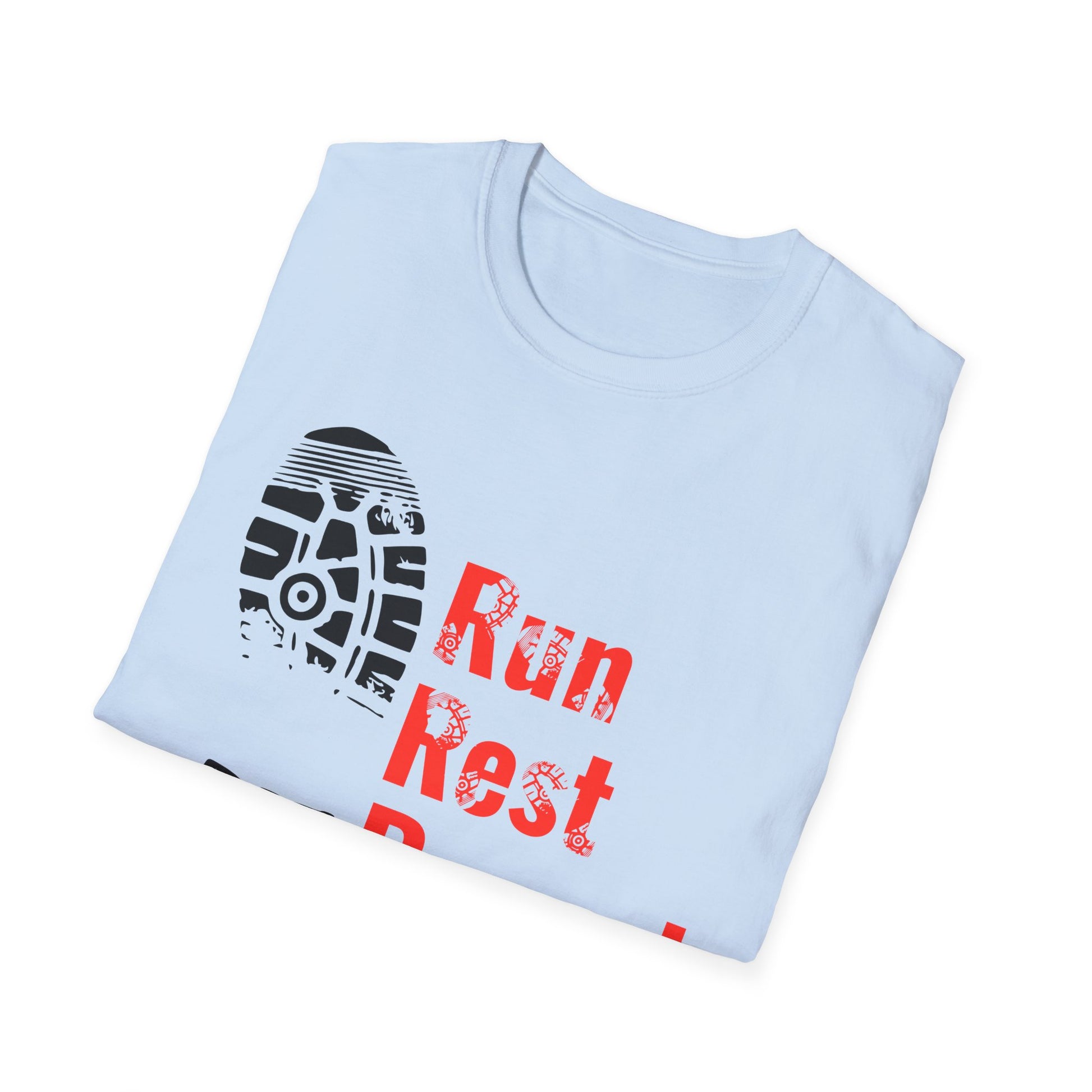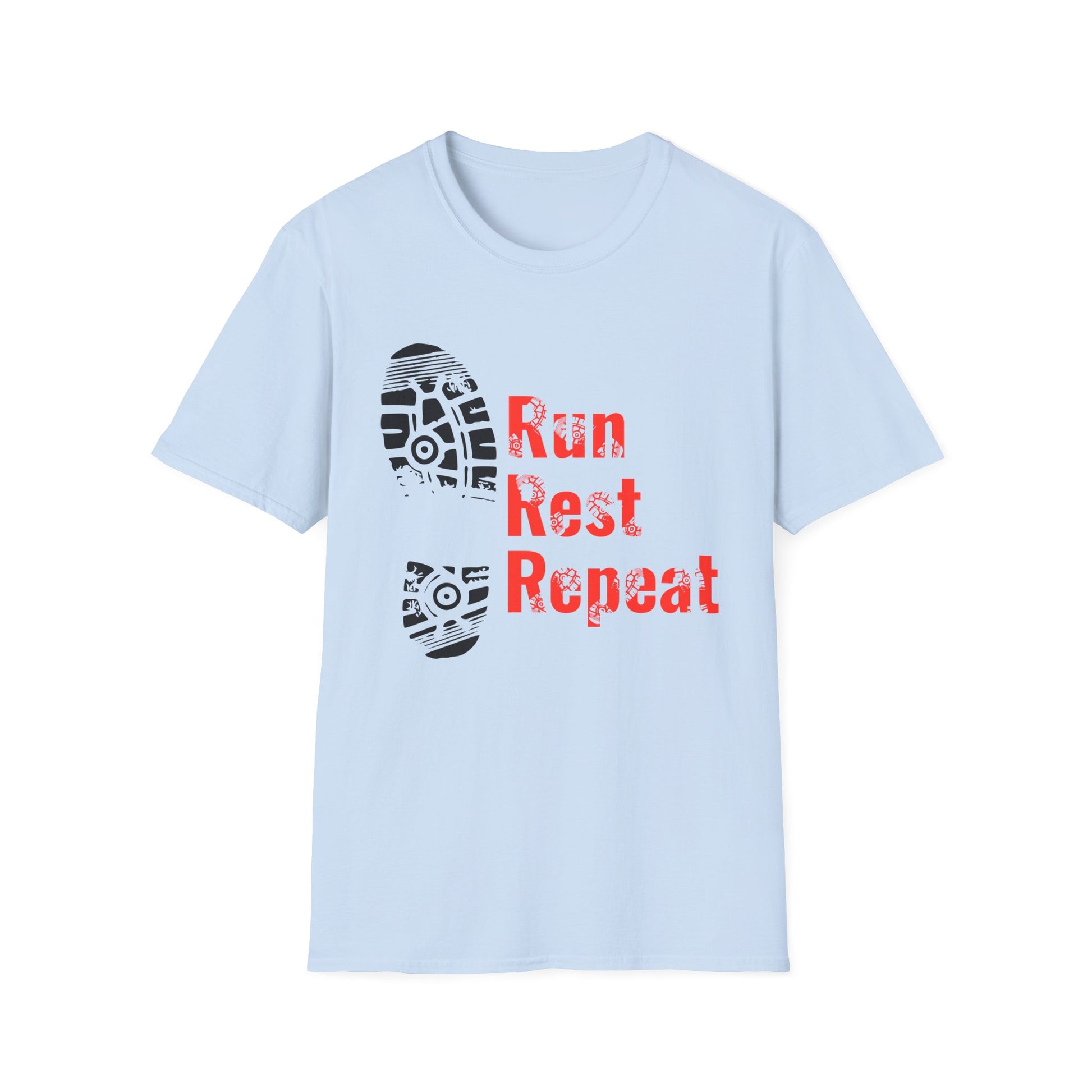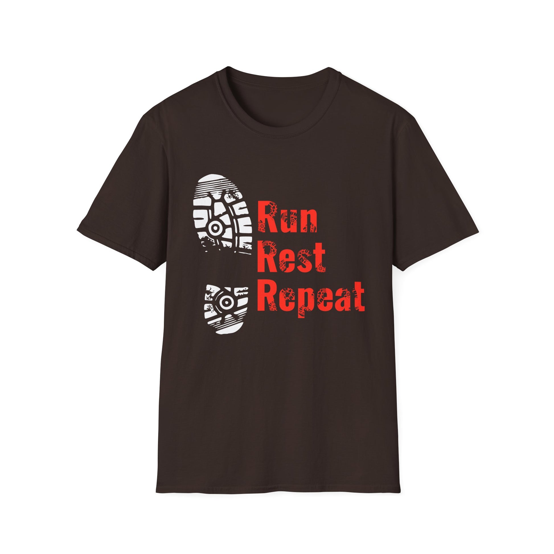 Lightweight, soft, and built for movement — this crew-neck shirt speaks the runner’s language. The front print pairs a worn-sole footprint with bold, stenciled text that reads “Run Rest Repeat,” evoking early-morning miles, post-run recovery, and the steady rhythm of training days. It sits comfortably for cool-downs, weekend long runs, or coffee after a track session. The breathable ring-spun cotton feels smooth against the skin and wears well under a hoodie or on its own during warmer routes. Simple, reliable, and honest — it’s made to move with you and age with your miles.