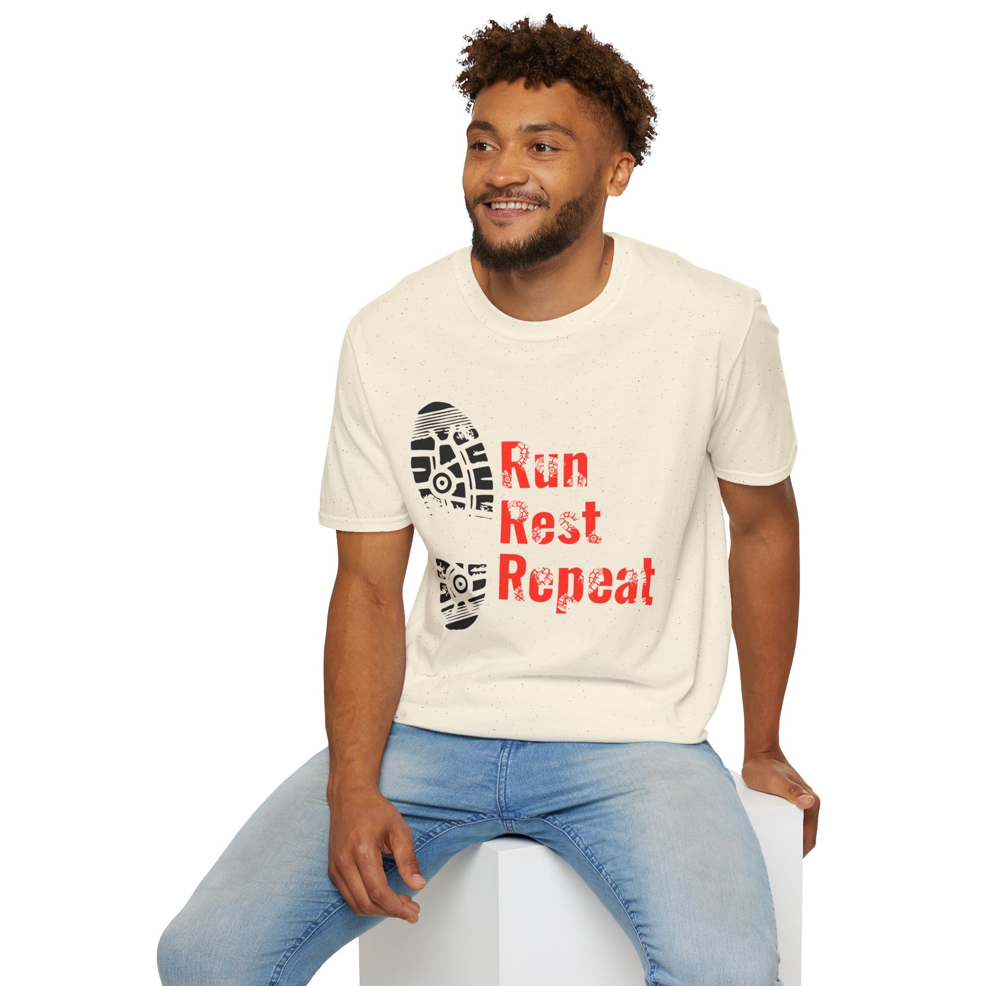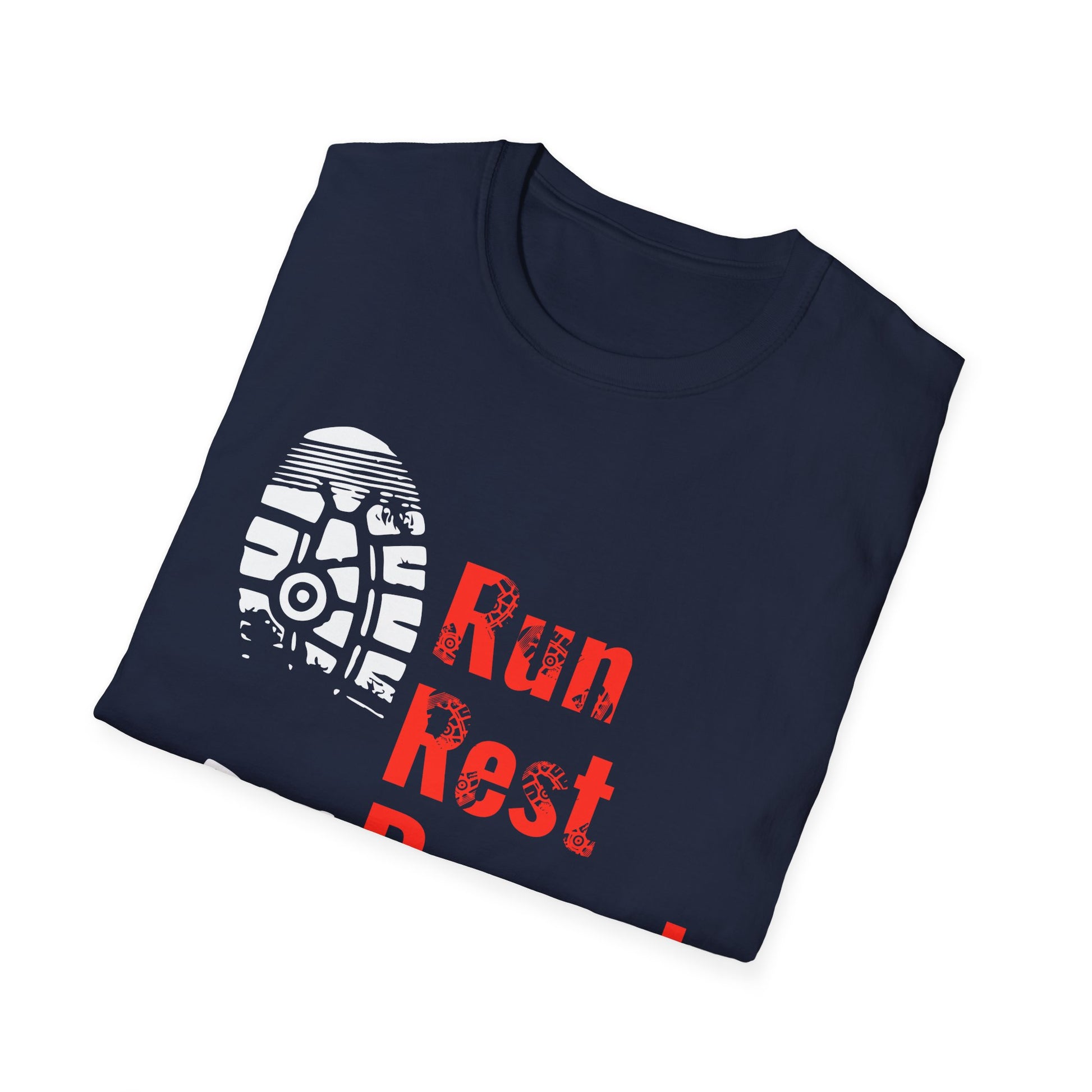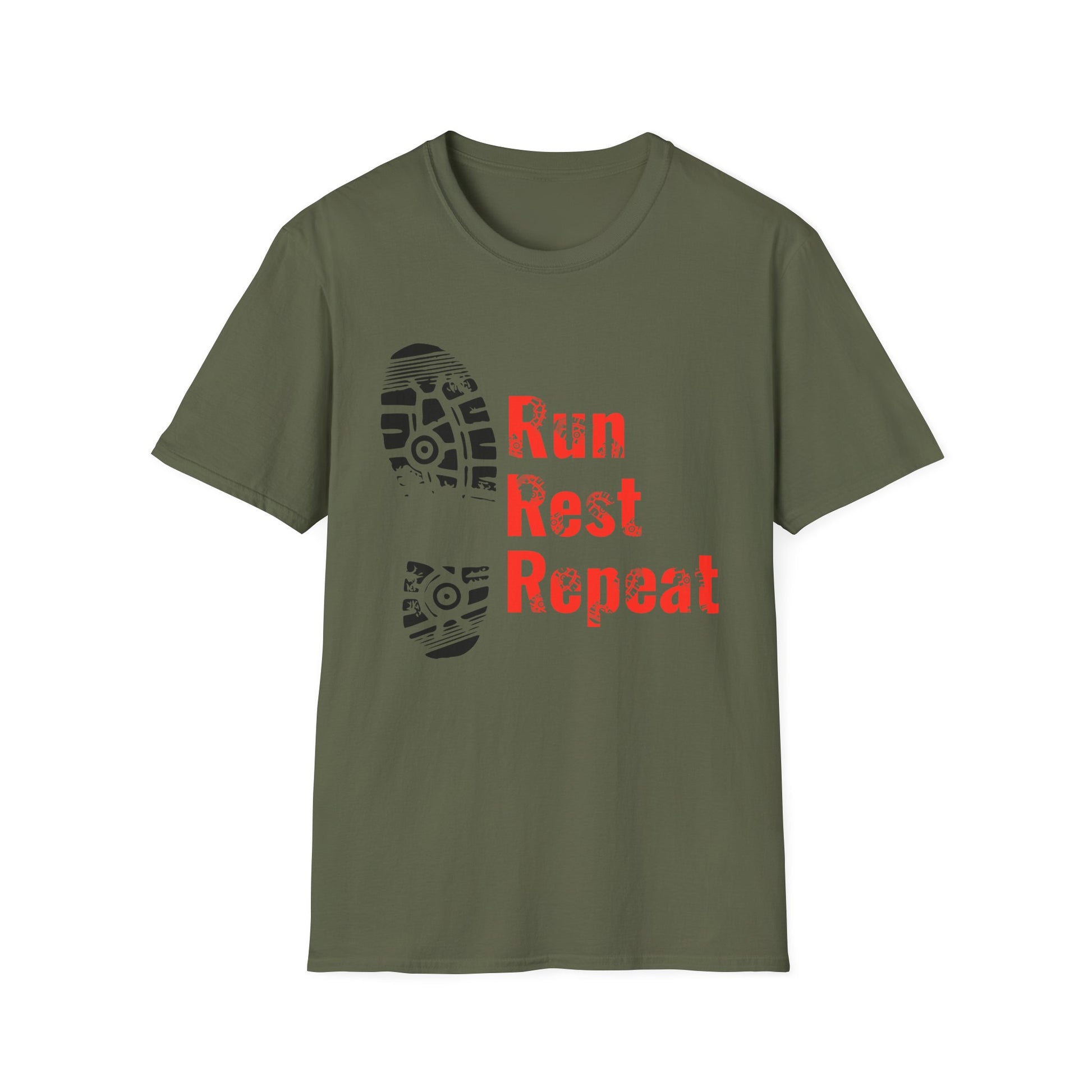 Lightweight, soft, and built for movement — this crew-neck shirt speaks the runner’s language. The front print pairs a worn-sole footprint with bold, stenciled text that reads “Run Rest Repeat,” evoking early-morning miles, post-run recovery, and the steady rhythm of training days. It sits comfortably for cool-downs, weekend long runs, or coffee after a track session. The breathable ring-spun cotton feels smooth against the skin and wears well under a hoodie or on its own during warmer routes. Simple, reliable, and honest — it’s made to move with you and age with your miles.