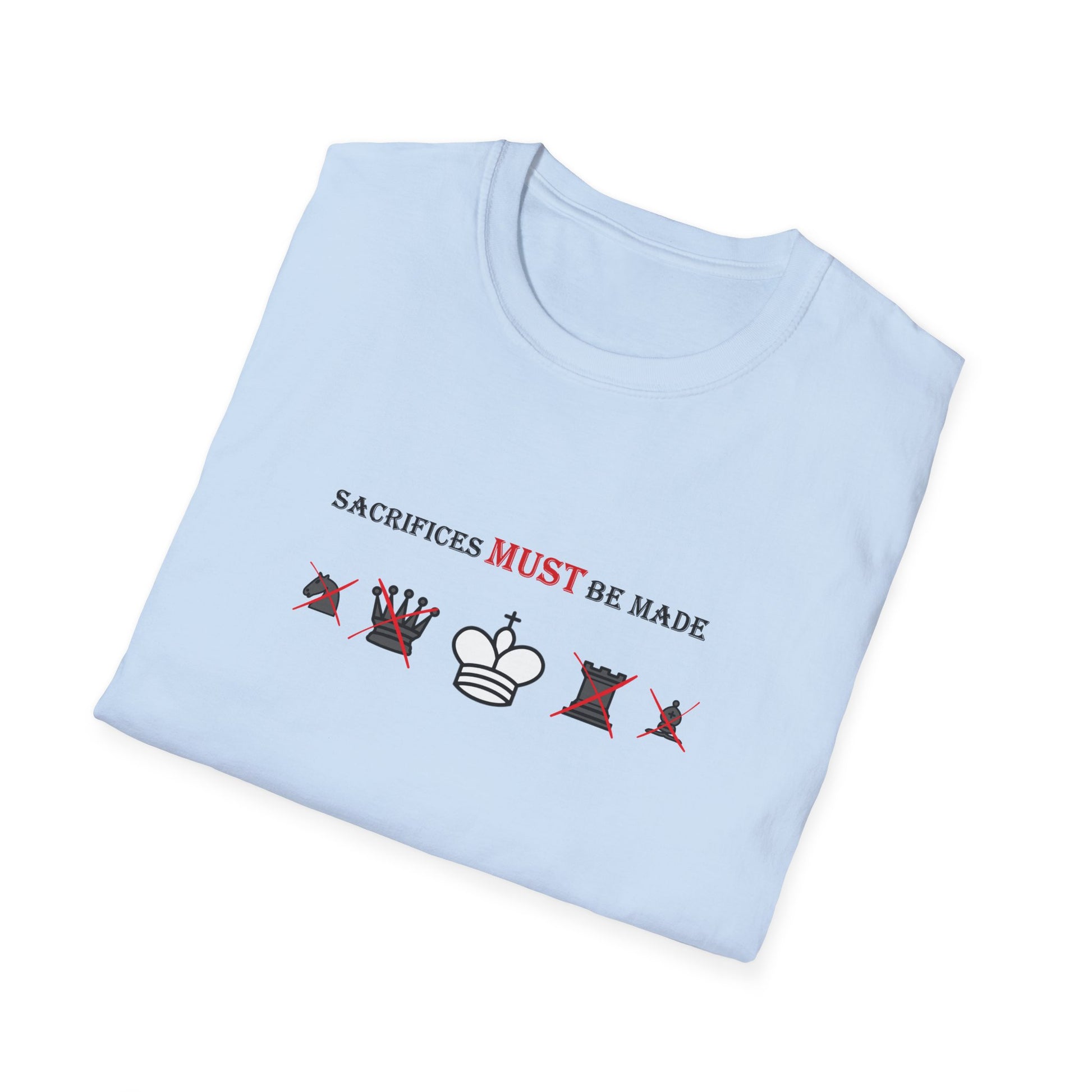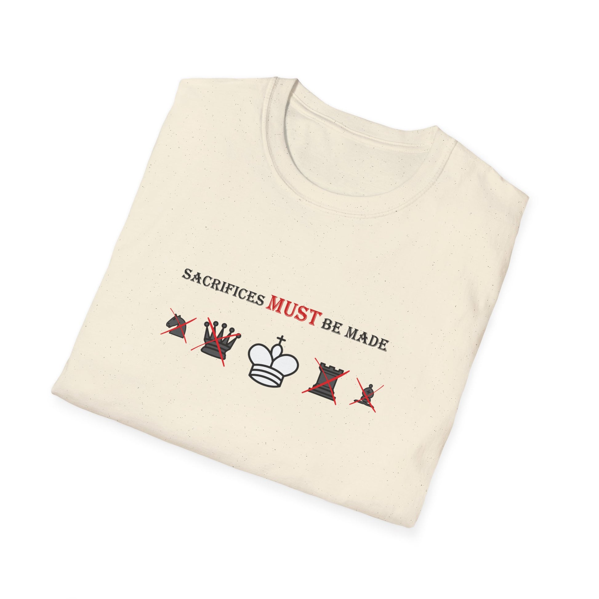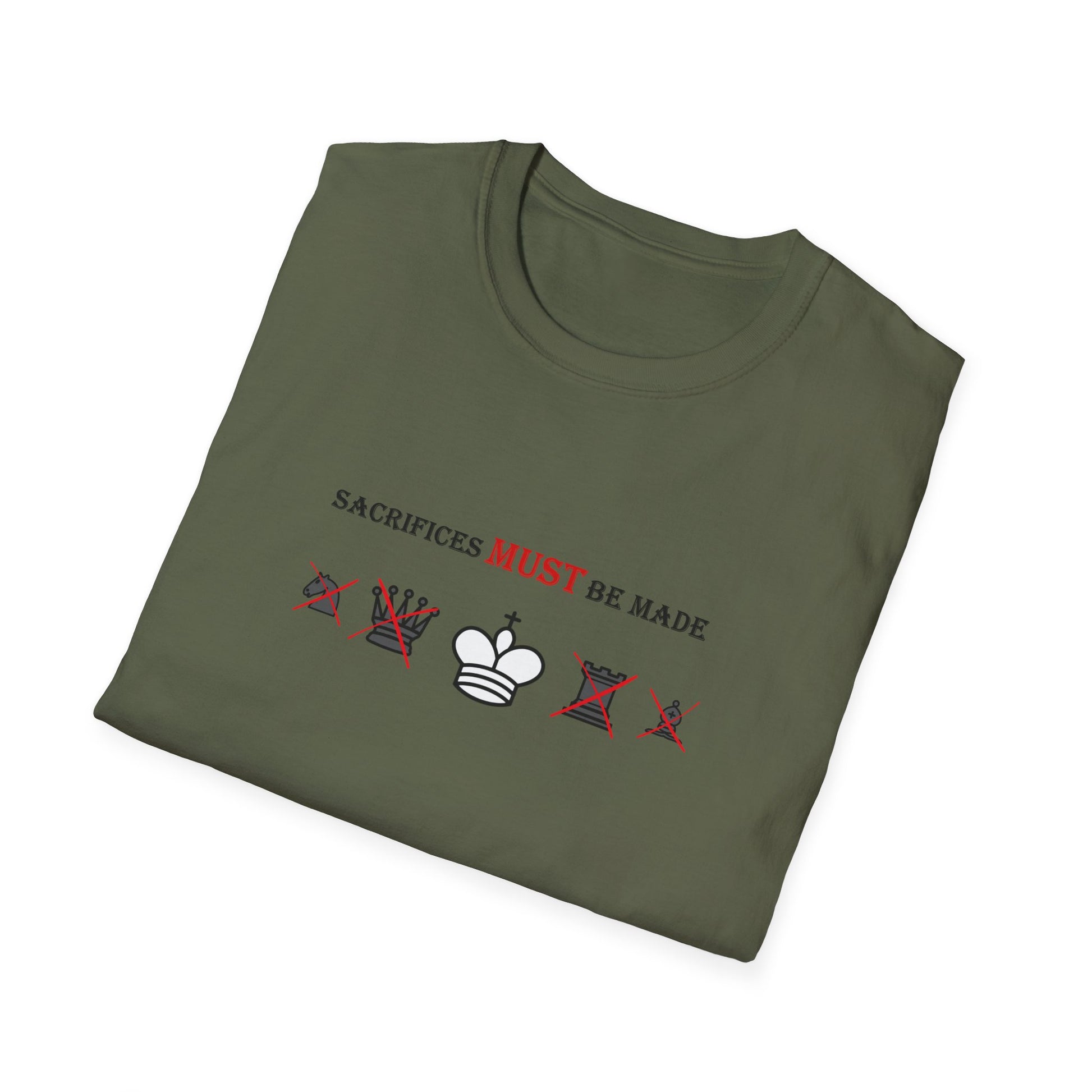 A lightweight, classic-fit tee that quietly speaks to chess players and strategy lovers. Clean, minimal icons line the chest beneath the words “SACRIFICES MUST BE MADE,” capturing that small, decisive moment when you trade material for position. Soft ring-spun cotton drapes easily—comfortable during long games, club nights, or a quiet coffee while replaying your favorite match. The subtle design sits low on the chest so the shirt reads like a private wink to anyone who knows the board. Wear it to a tournament, study session, or casual meet-up and let it start the kind of conversation only fellow tacticians will chase.