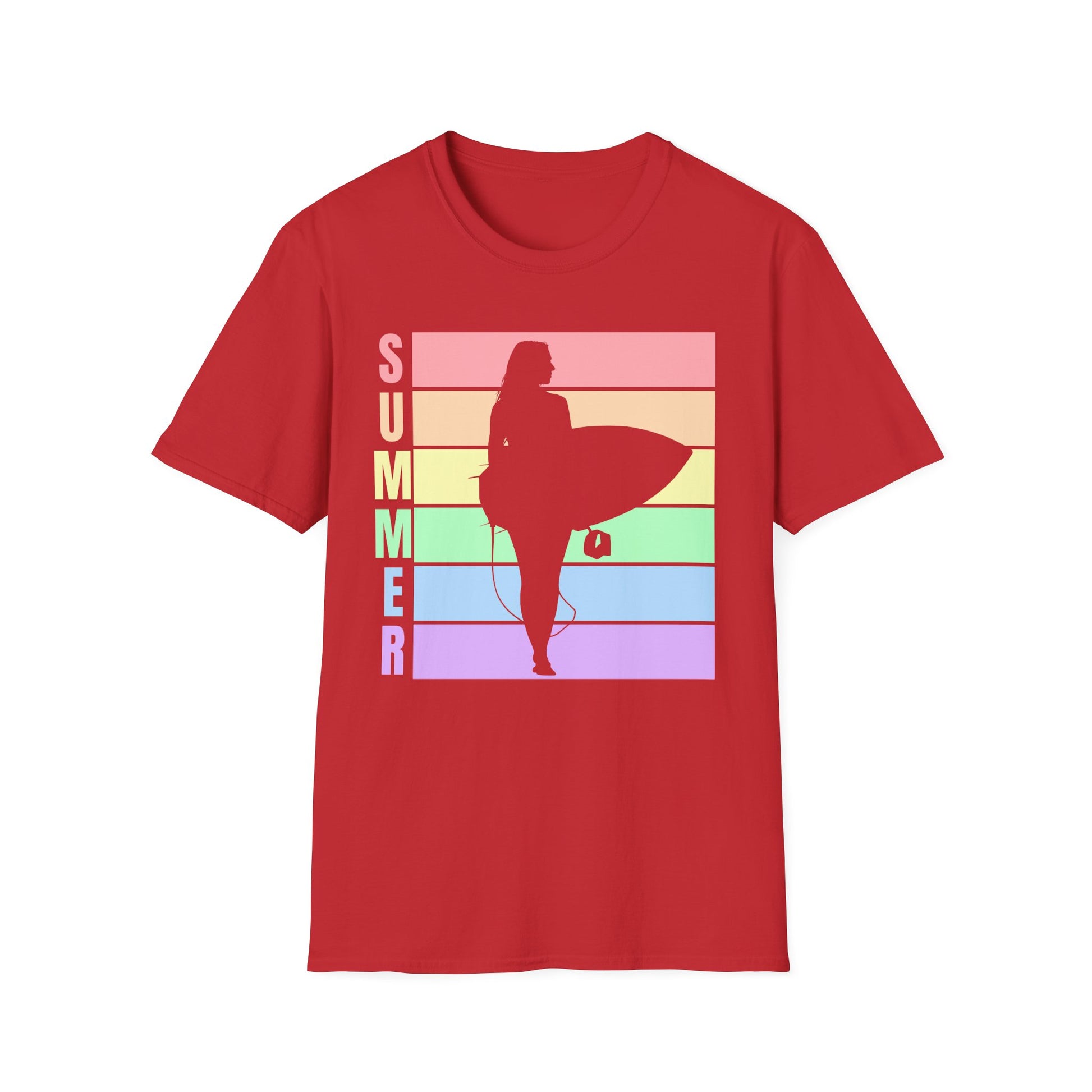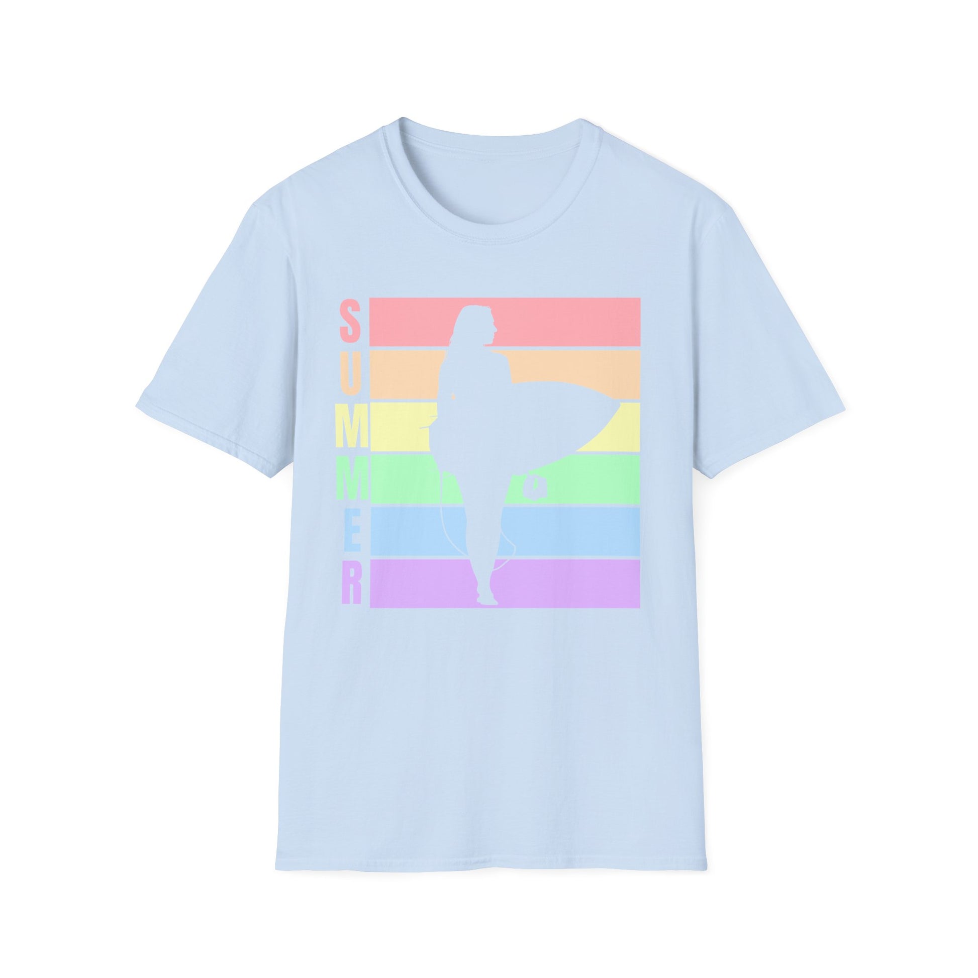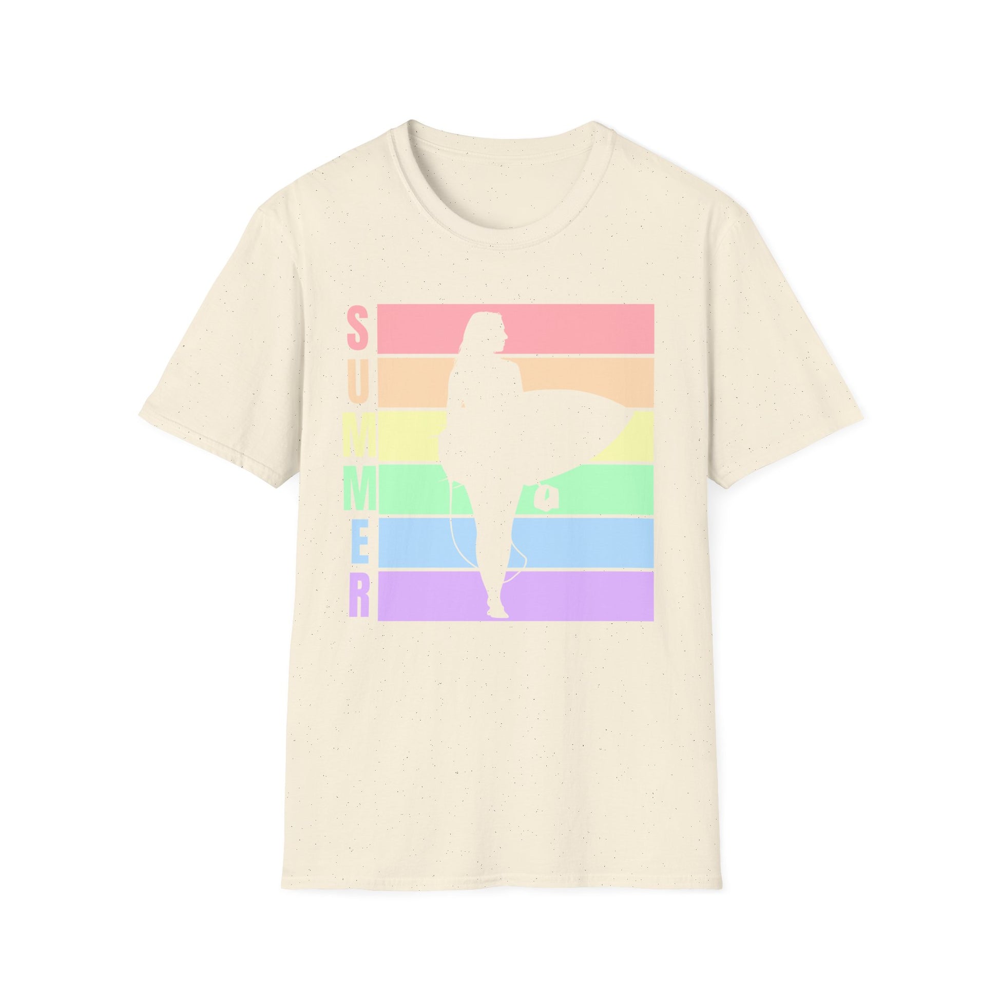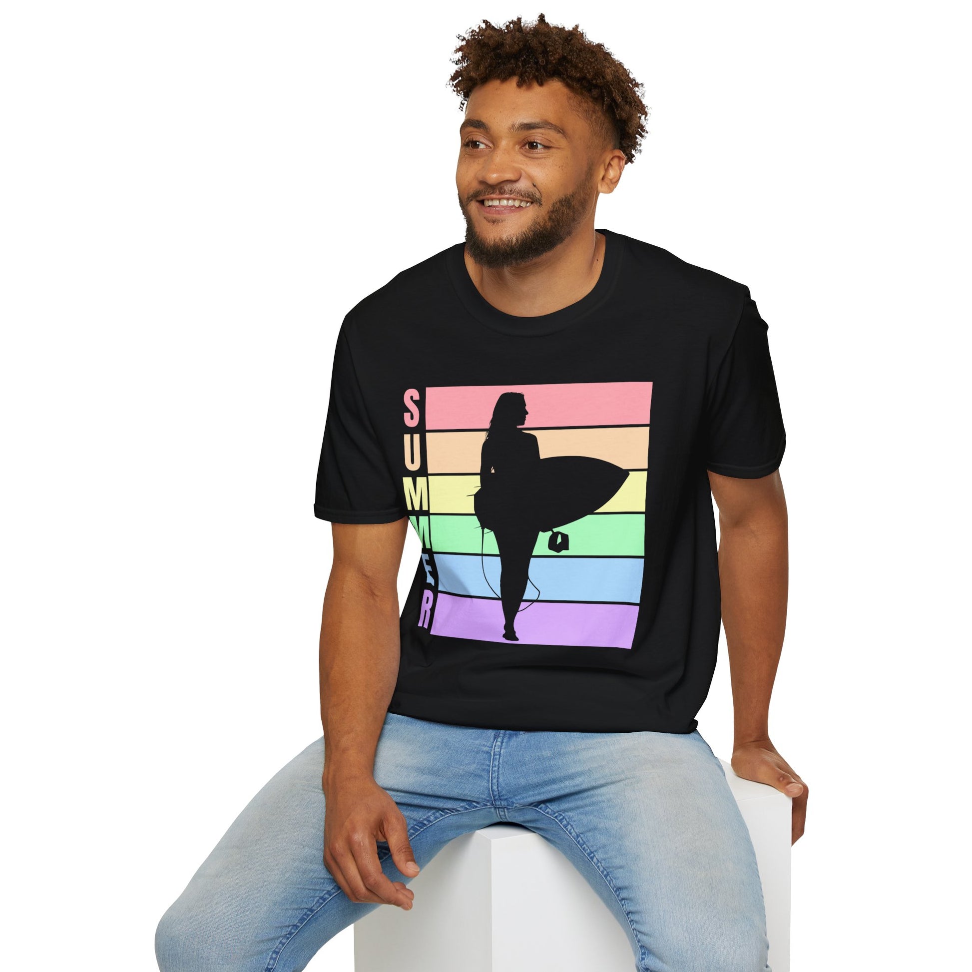 A lightweight, soft cotton tee that brings sun-soaked, beachside energy to everyday wear. A minimalist surfer silhouette sits inside warm, pastel stripes that read "SUMMER" down the side — a quiet nod to long mornings by the water and salt on the skin. The fabric feels smooth against bare arms and breathes through heat, while the classic crew cut keeps the look simple and easy to layer. Wear it to stroll the boardwalk, pack it for a coastal weekend, or pull it on after a dawn surf as you sip coffee and let the day unfold.