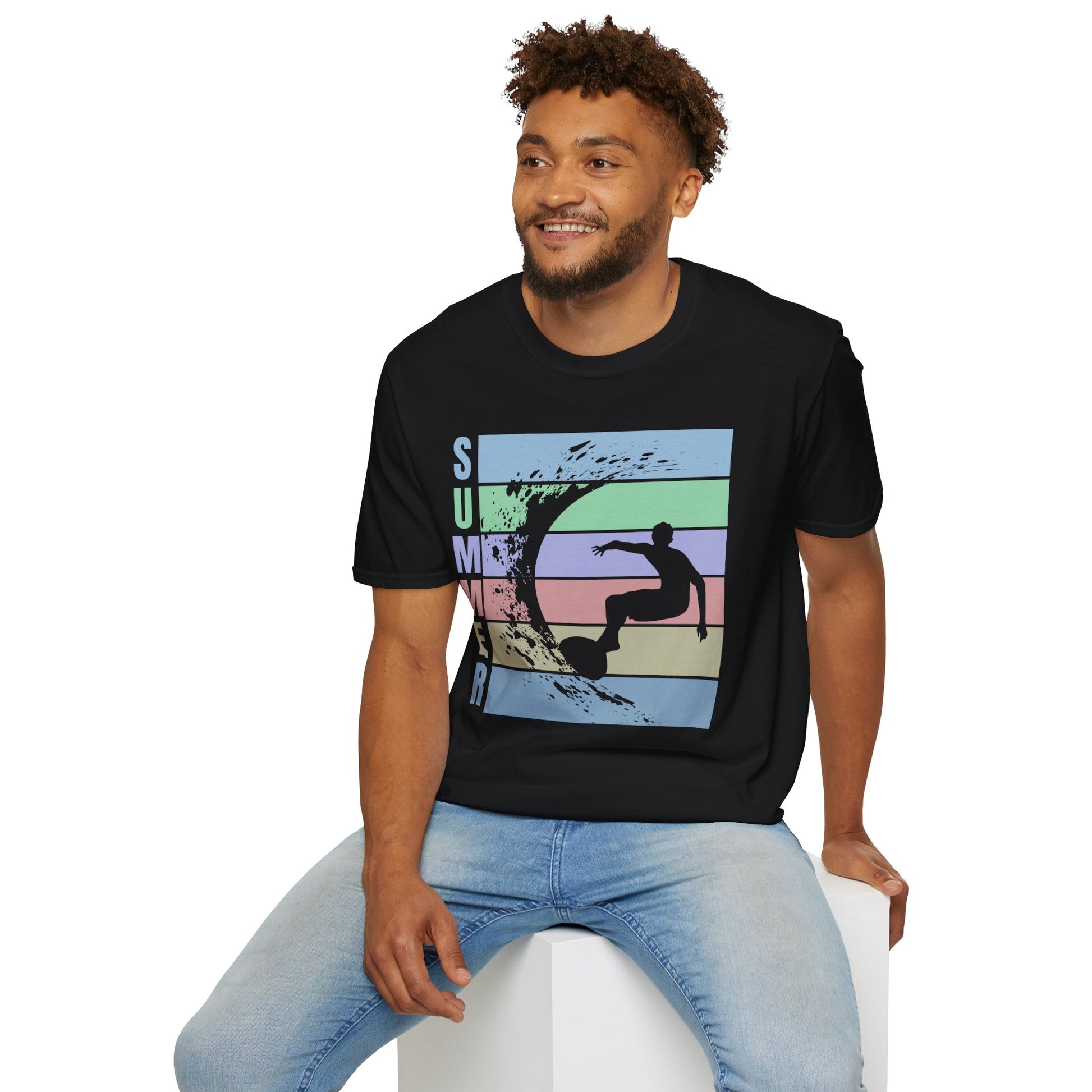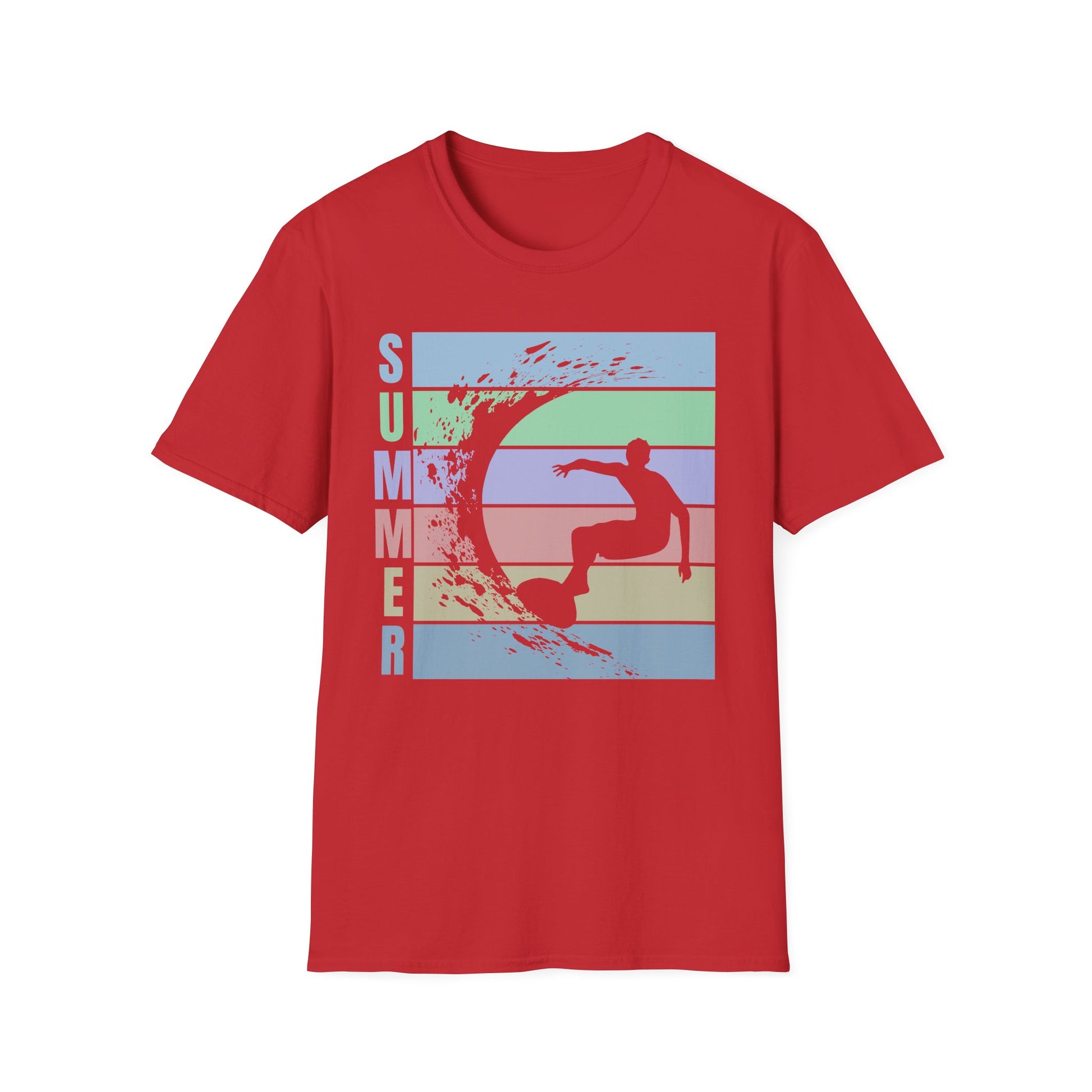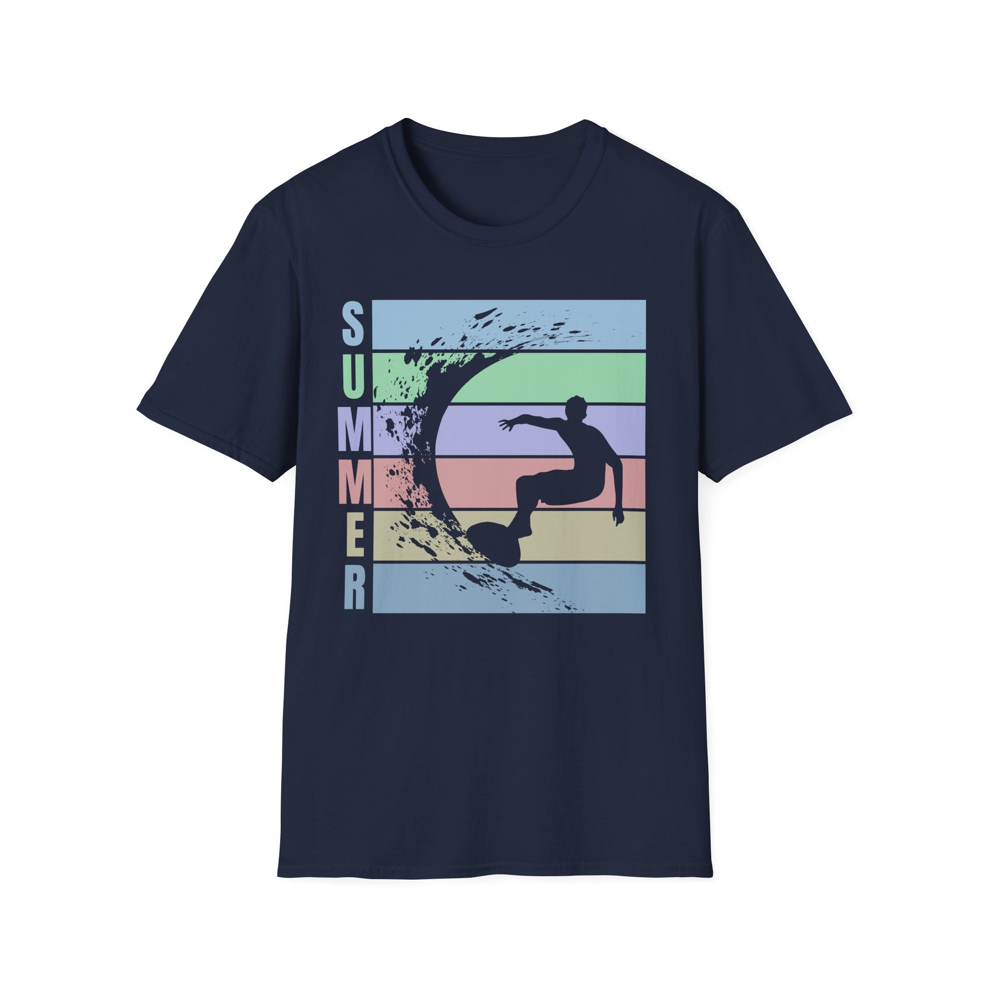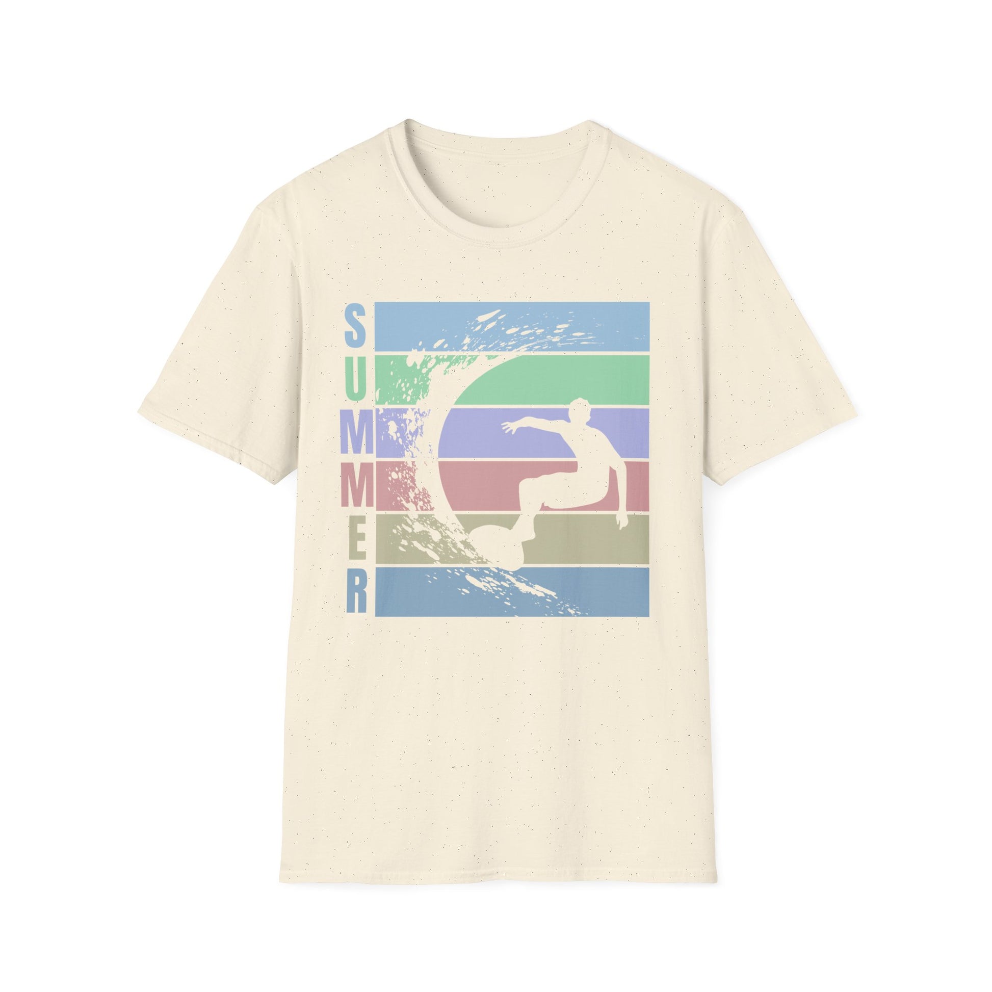 Lightweight and breathable, this classic crew tee brings that slow, sunlit summer feeling to everyday wear. A soft, ring-spun cotton body carries a retro-striped graphic of a surfer carving a wave — muted pastels and a distressed finish give it a lived-in, vintage vibe. Wear it after a morning surf, on boardwalk strolls, or while sipping coffee at a seaside cafe. The cut is relaxed and easy, the collar stays shape-retentive, and the smooth fabric is made to hold prints with crisp detail. Subtle details like a tear-away label and shoulder tape keep the fit comfortable and lasting. This shirt settles into your rotation and feels like the shirt you reached for all season long.