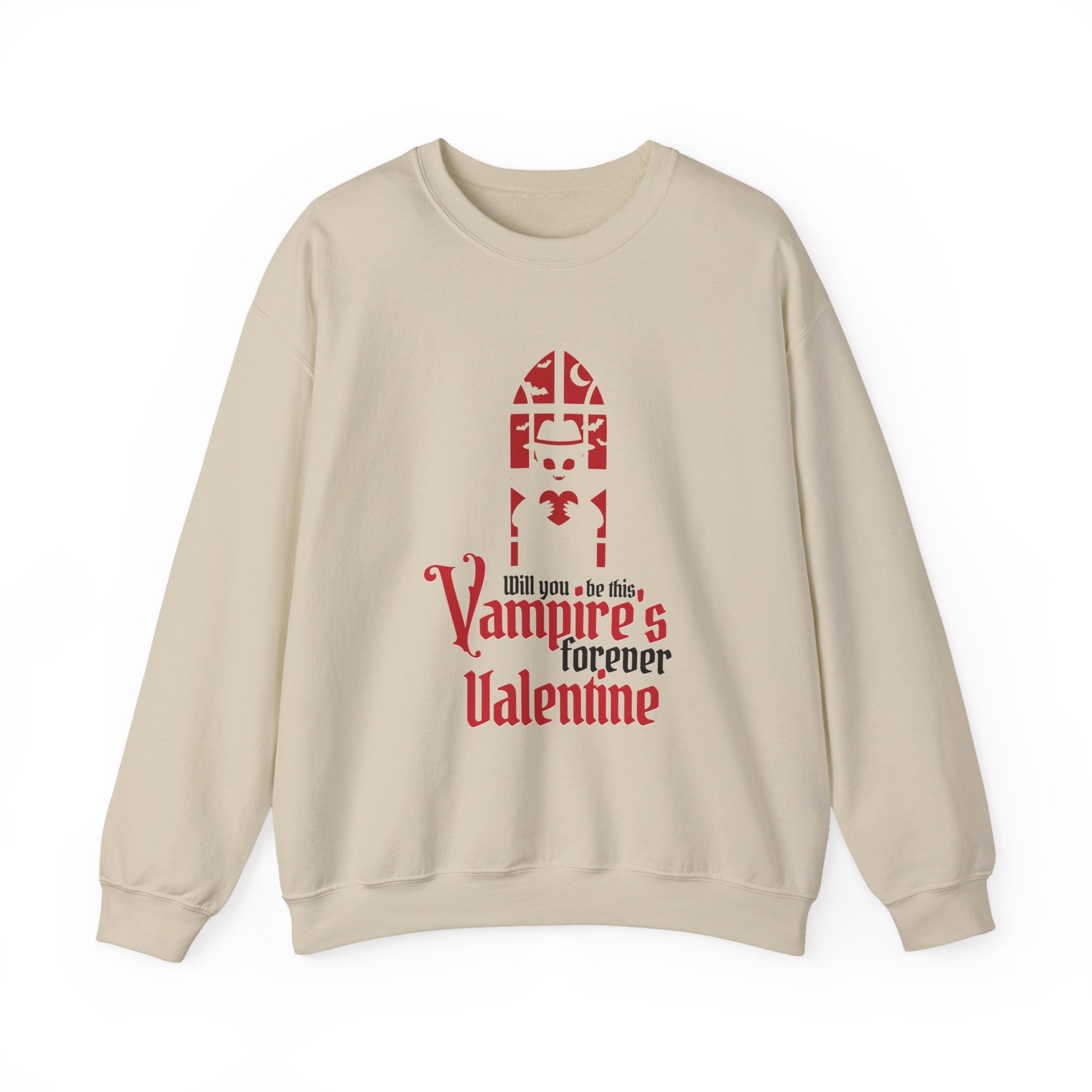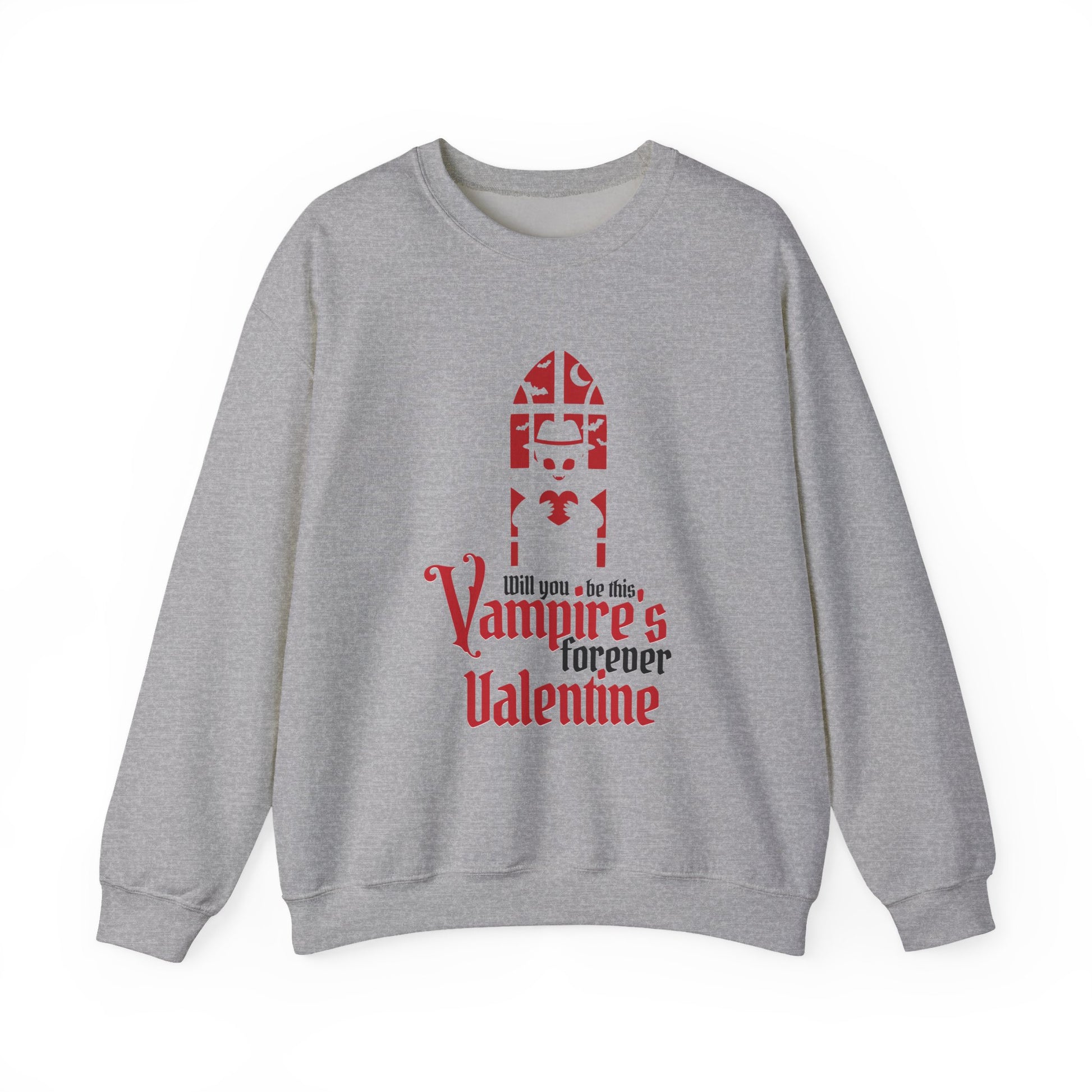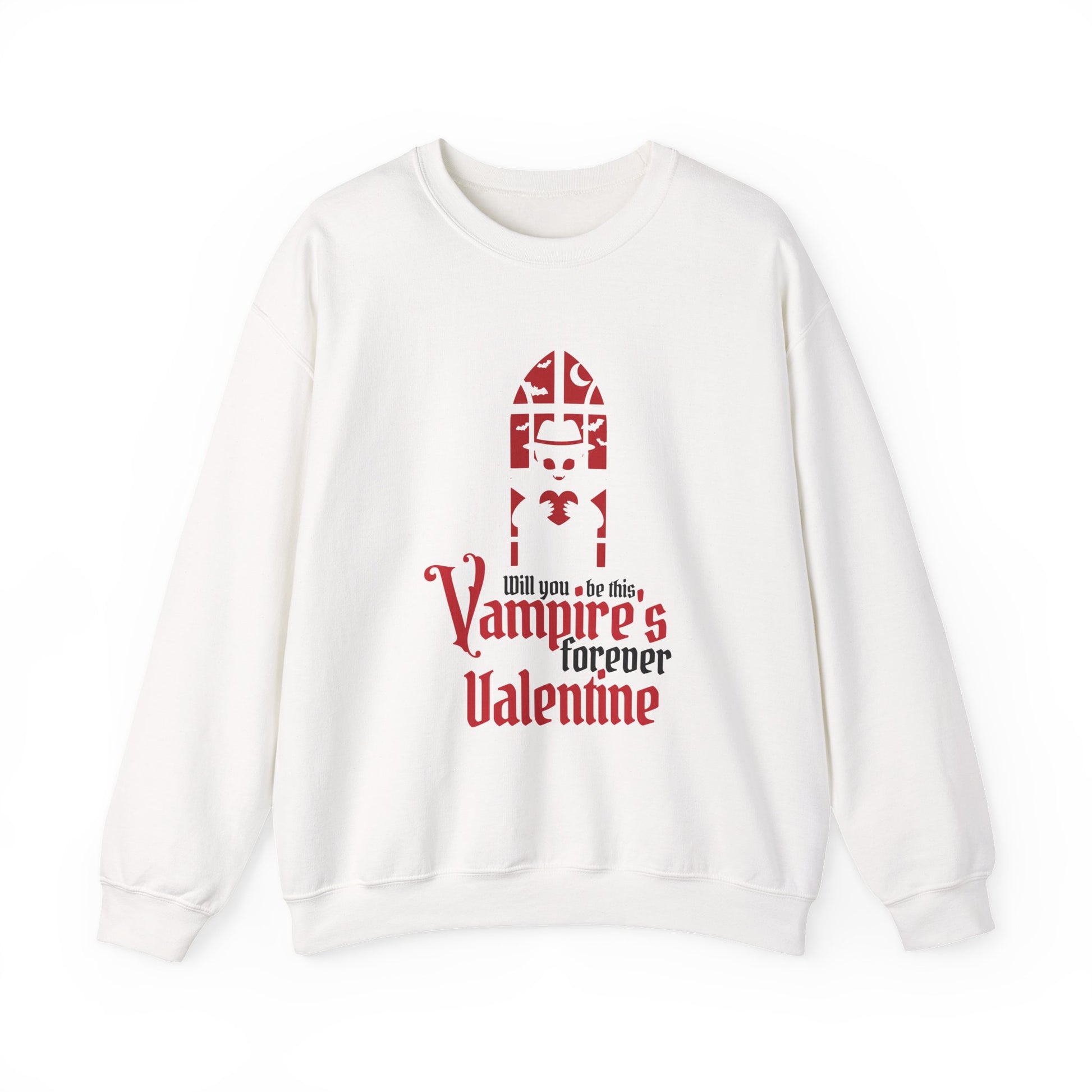 Soft, slightly oversized, and whisper-quiet, this crewneck carries a darkly romantic mood. A stylized gothic window and blood-red lettering read “Vampires forever Valentine,” giving the sweatshirt a playful, nocturnal edge. It sits like a warm, wearable poem — the kind you pull on for late-night walks, movie marathons, or cozying up with a vintage paperback. The medium-heavy 50/50 cotton-poly knit keeps its shape and warmth while the clean crew neckline and double-needle stitching ensure it holds up through repeat wear. Subtle, intentional details — tear-away label for comfort, ethically sourced cotton, and options for embroidered accents — make it feel considered, not mass-produced. The overall vibe is intimate and a little mischievous: a quiet statement piece for people who prefer moonlit romance to glittering heart-shaped clichés.