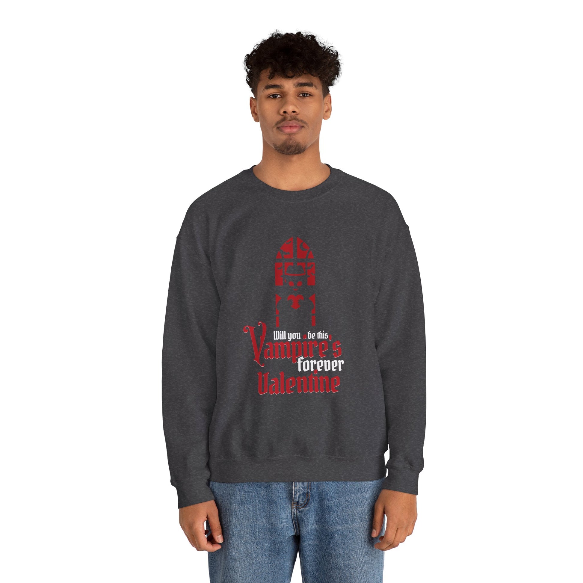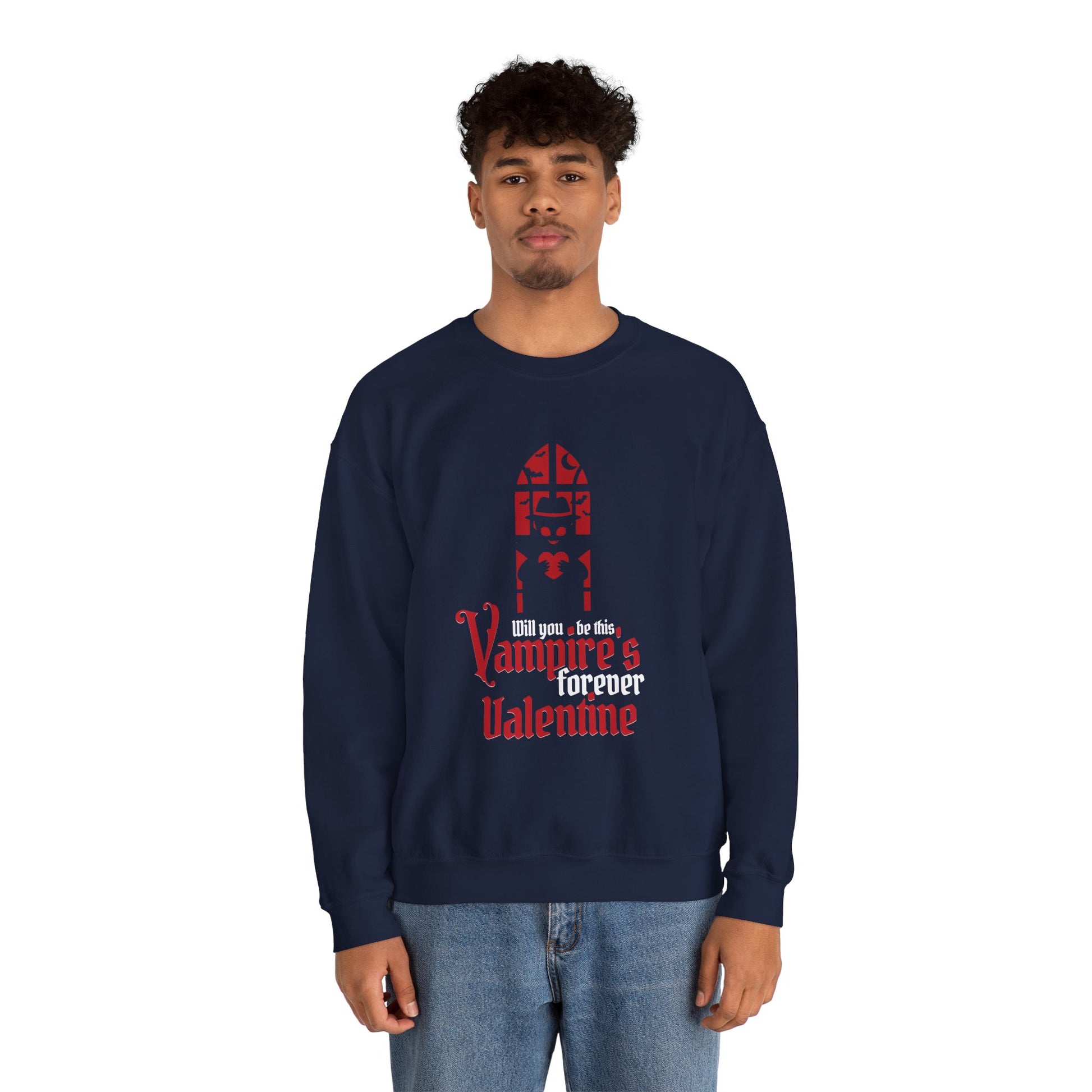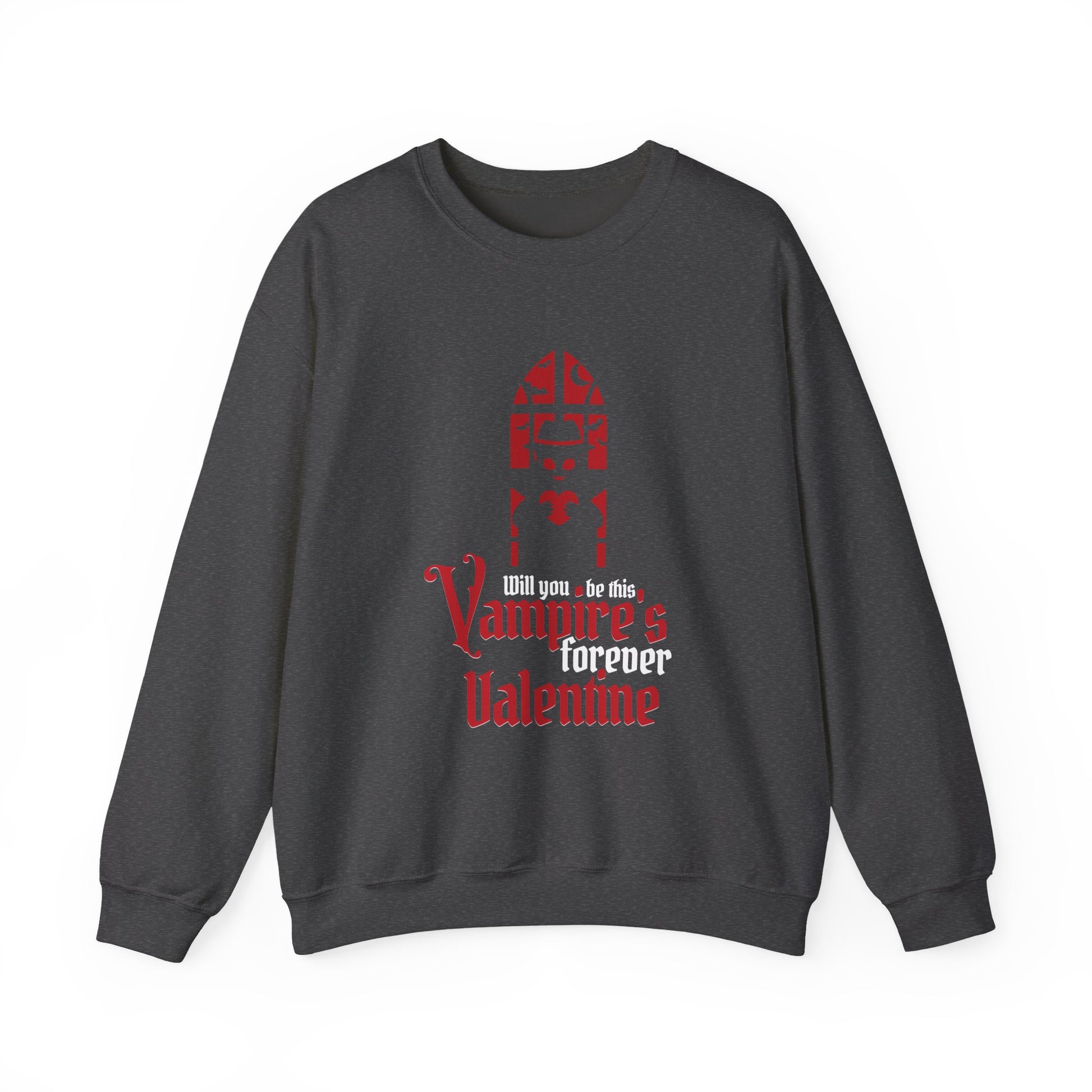 Soft, slightly oversized, and whisper-quiet, this crewneck carries a darkly romantic mood. A stylized gothic window and blood-red lettering read “Vampires forever Valentine,” giving the sweatshirt a playful, nocturnal edge. It sits like a warm, wearable poem — the kind you pull on for late-night walks, movie marathons, or cozying up with a vintage paperback. The medium-heavy 50/50 cotton-poly knit keeps its shape and warmth while the clean crew neckline and double-needle stitching ensure it holds up through repeat wear. Subtle, intentional details — tear-away label for comfort, ethically sourced cotton, and options for embroidered accents — make it feel considered, not mass-produced. The overall vibe is intimate and a little mischievous: a quiet statement piece for people who prefer moonlit romance to glittering heart-shaped clichés.